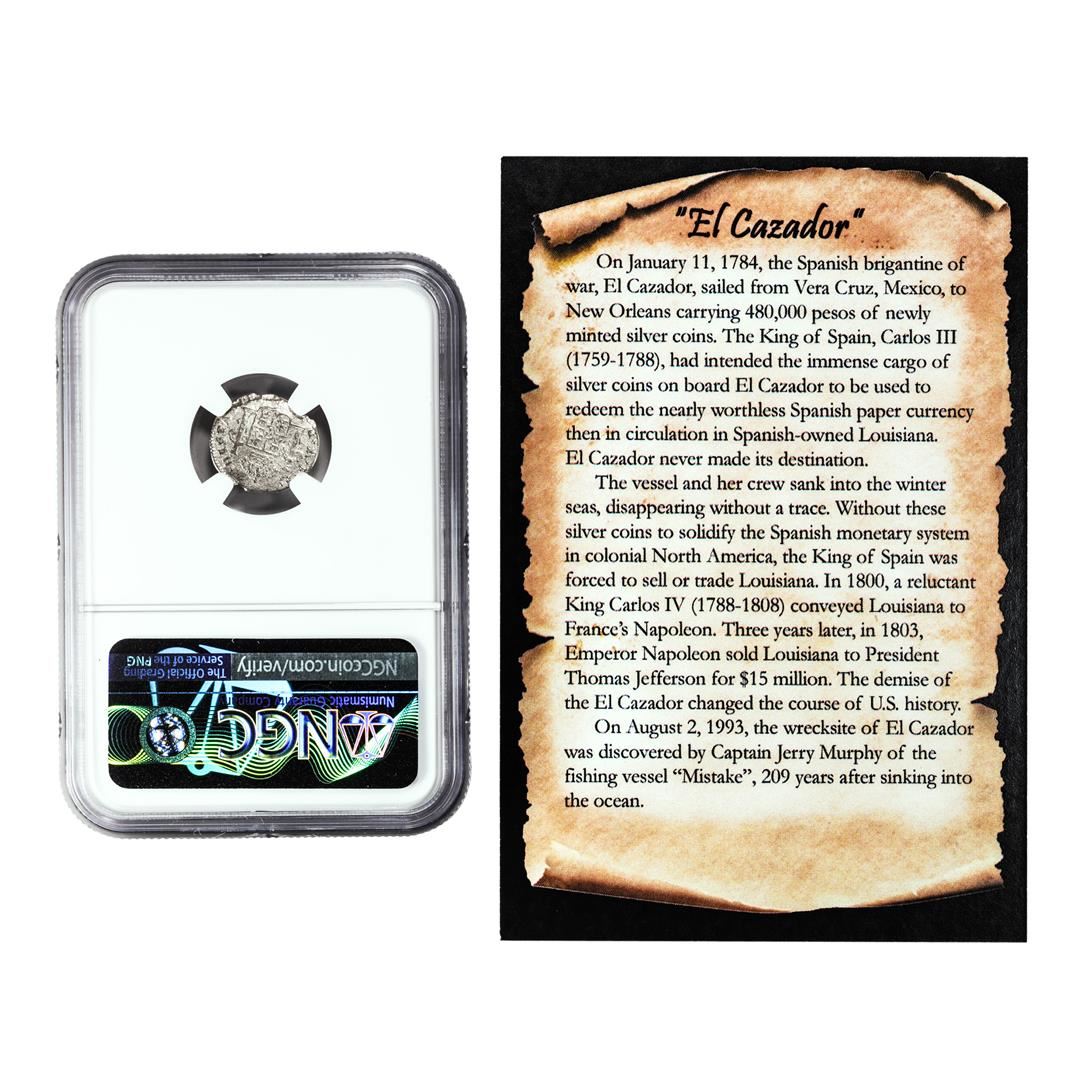 El Cazador Shipwreck (1772-83) Mexico 1/2 Real Silver Coin NGC Genuine w/ Story Card