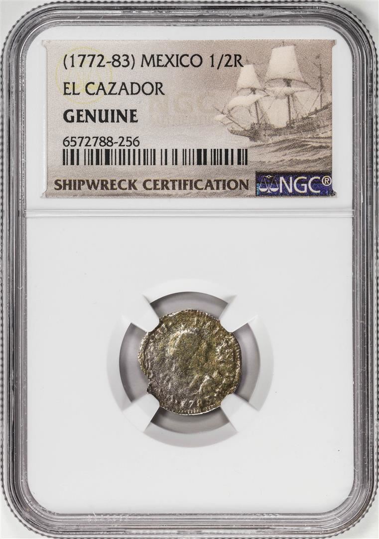 One El Cazador Shipwreck (1772-83) Mexico 1/2 Real Silver Coin NGC Genuine w/ Story Card. NGC Certified.