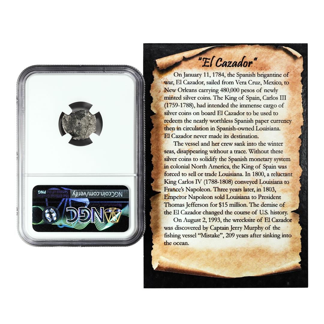 One El Cazador Shipwreck (1772-83) Mexico 1/2 Real Silver Coin NGC Genuine w/ Story Card. NGC Certified.