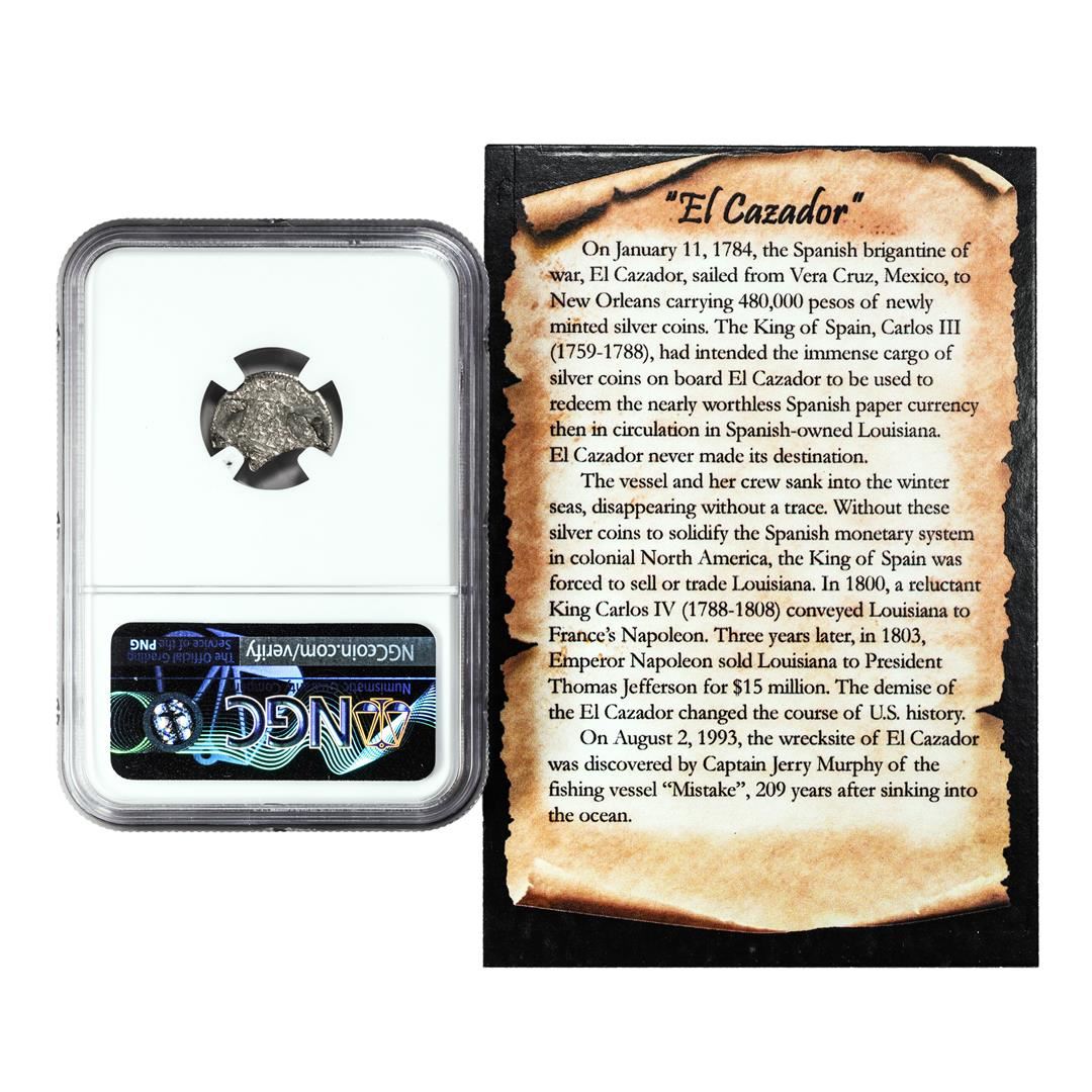 El Cazador Shipwreck (1772-83) Mexico 1/2 Real Silver Coin NGC Genuine w/ Story Card
