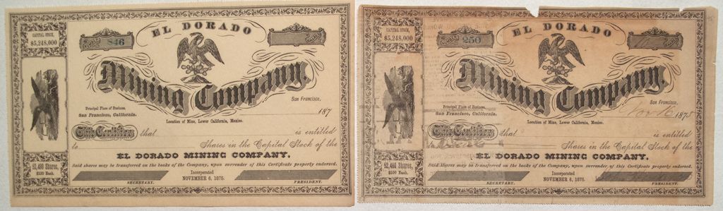 Cert. # 250 for 10 shares issued to (Blank). Signatures unreadable. Definite signs of wear. Small tears along top and right side.