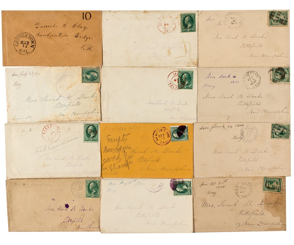 c1854 Lot of 12: USPS covers from the gold mining town of Georgetown. The USPS cancellation/ postmarks are a diverse 6 different types, and stamped in inks of blue, green and red. These postmarks are listed in the "California Town Postmarks" book by J.H. Williams as follows: Georgetown, ELD-1400, rarity 5, ELD-1460, rarity 3, ELD-1440, rarity 3, ELD-1450, rarity 3, The remaining covers are listed in the book as ELD-1480, rarity 3, and are octagon in shape, typical for 4. The El Dorado area was a famous gold area in 1850`s and later, and had towns and camps like Placerville, Coloma, Indian Diggins, and many others. Overall good condition, some very rare. - HKA#64089