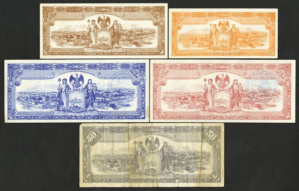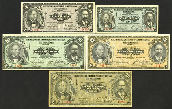 Mexico, Revolutionary. Sinaloa. 50 Centavos, 1, 5, 10, 50 Pesos. SCWPM S1042; S1043c; S1044b; S1045b; S1045 (4 printed signatures). Fine to Extremely Fine. 5 pieces.