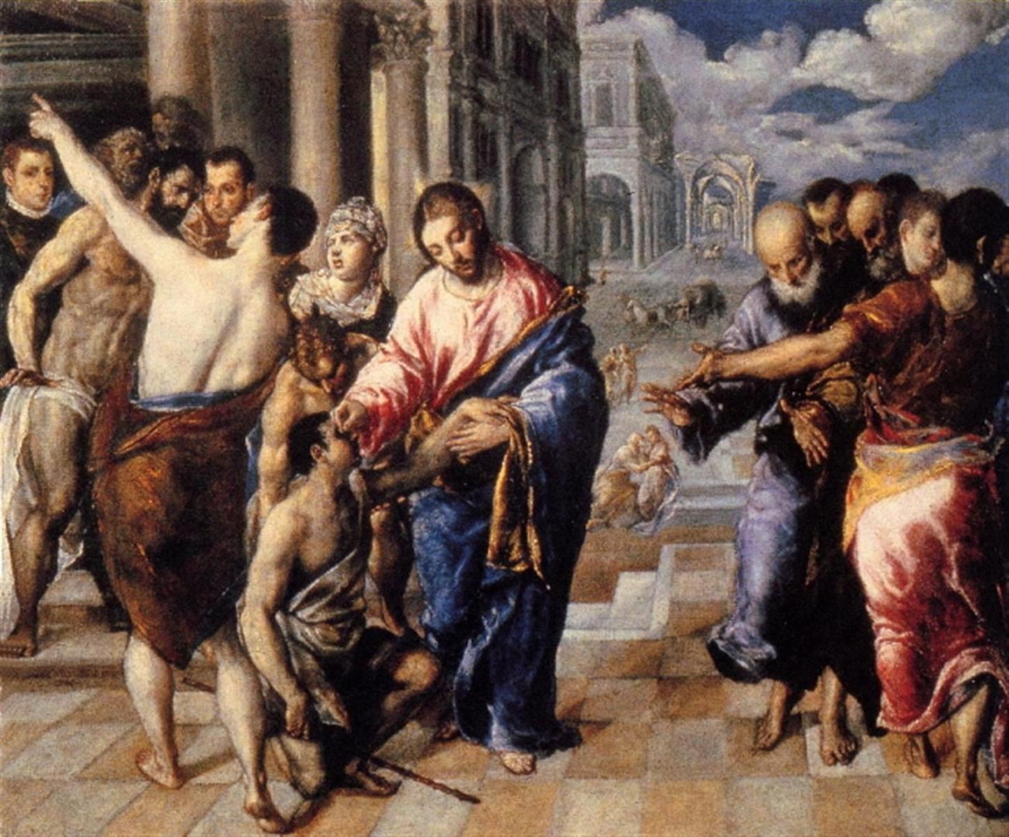 Artist: El Greco - Title: Christ Healing the Blind - Medium: Fine Art Giclee on Canvas - Image Size: Approximately 20 inches x 16.75 inches - Unframed on Unstretched Canvas - Biography: Doménikos Theotokópoulos (c.October 1541-7 April 1614), most widely known as El Greco ("The Greek"), was a Greek painter, sculptor and architect of the Spanish Renaissance. "El Greco" was a nickname, a reference to his Greek origin, and the artist normally signed his paintings with his full birth name in Greek letters, adding the word, Cretan.El Greco was born in the center of Post-Byzantine art. He trained and became a master within that tradition before traveling at age 26 to Venice, as other Greek artists had done. In 1570, he moved to Rome, where he opened a workshop and executed a series of works. During his stay in Italy, El Greco enriched his style with elements of Mannerism and of the Venetian Renaissance taken from a number of great artists of the time, notably Tintoretto. In 1577, he moved to Toledo, Spain, where he lived and worked until his death.