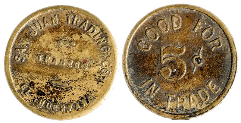 Obverse: San Juan Trading Co. / Traders / El Huerfano; reverse: Good for / 5c / In Trade. Br, 21mm, R10. Very good condition, deep toning. El Huerfano is Spanish for "orphan." It is 10 miles east of Simpsoo.