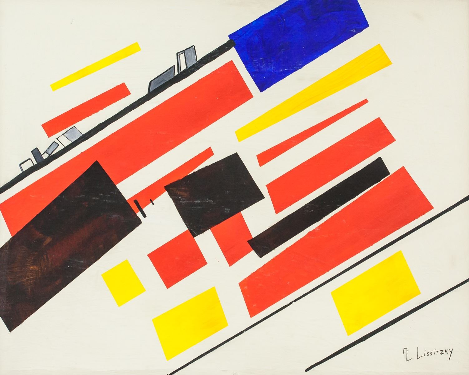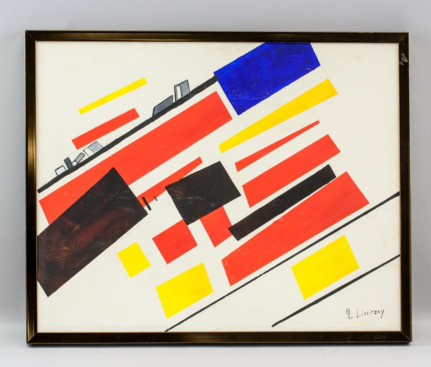 Oil on canvas, framed. Featuring a constructivist composition. Signed El Lissitzky on the lower right corner. Attributed to El Lissitzky (1890-1941, Russian). 39.5 x 49.5 cm (15.5 x 19.5 inches). Framed size: 43 x 53 cm (17 x 20.8 inches). PROVENANCE: Southern Ontario estate