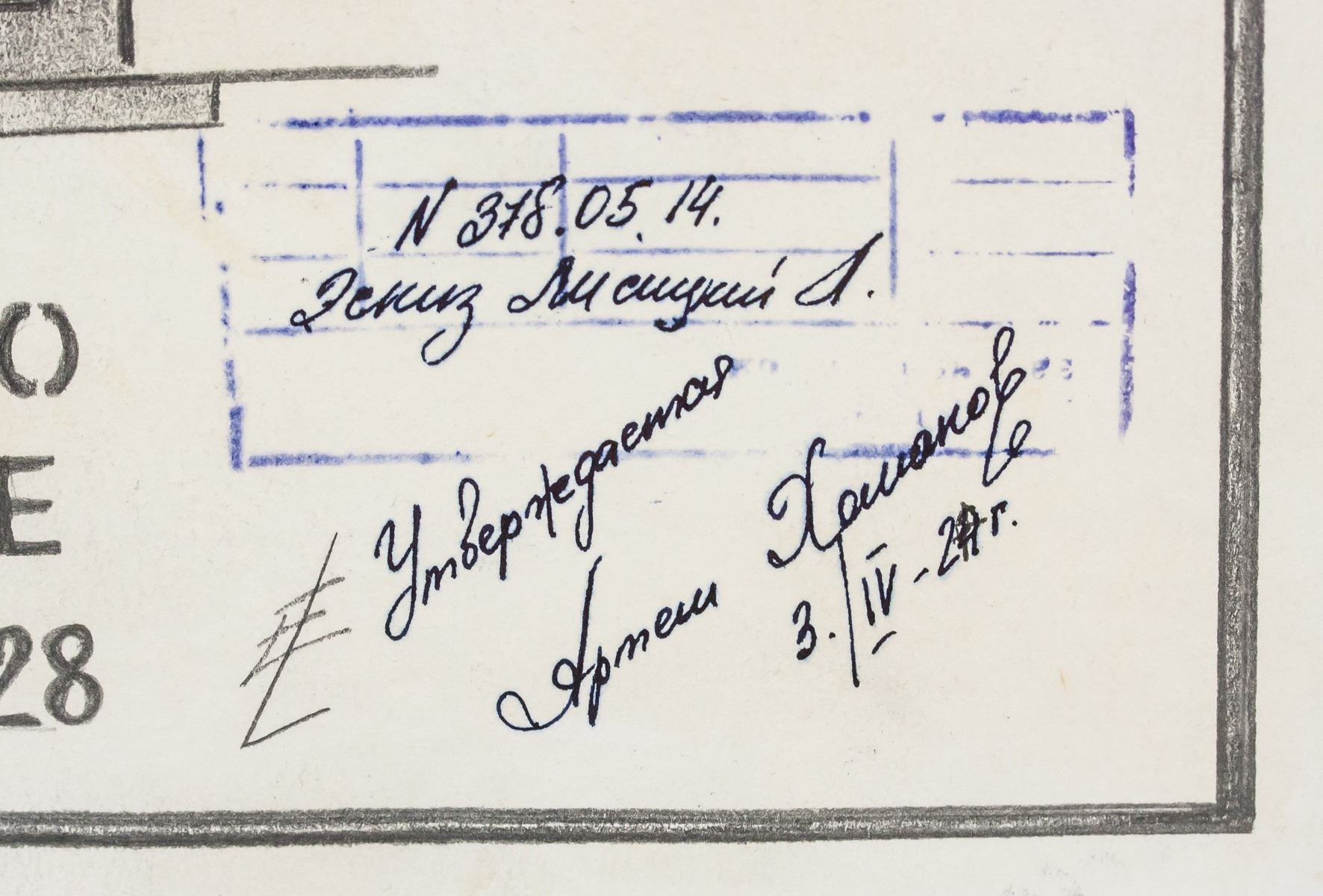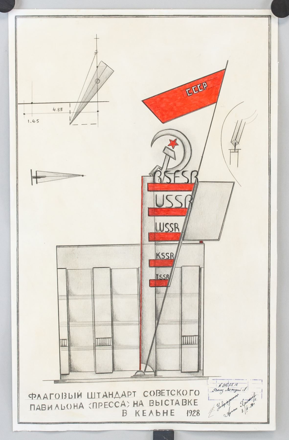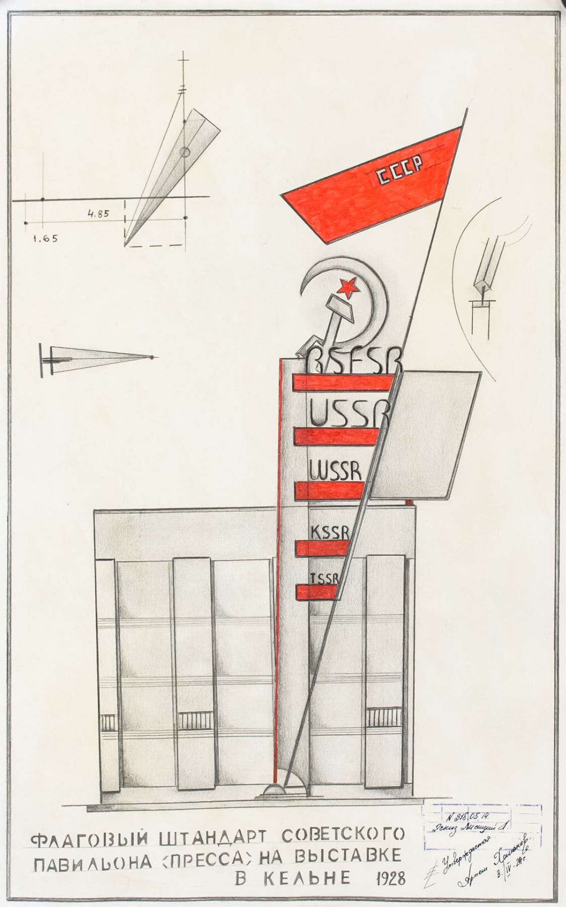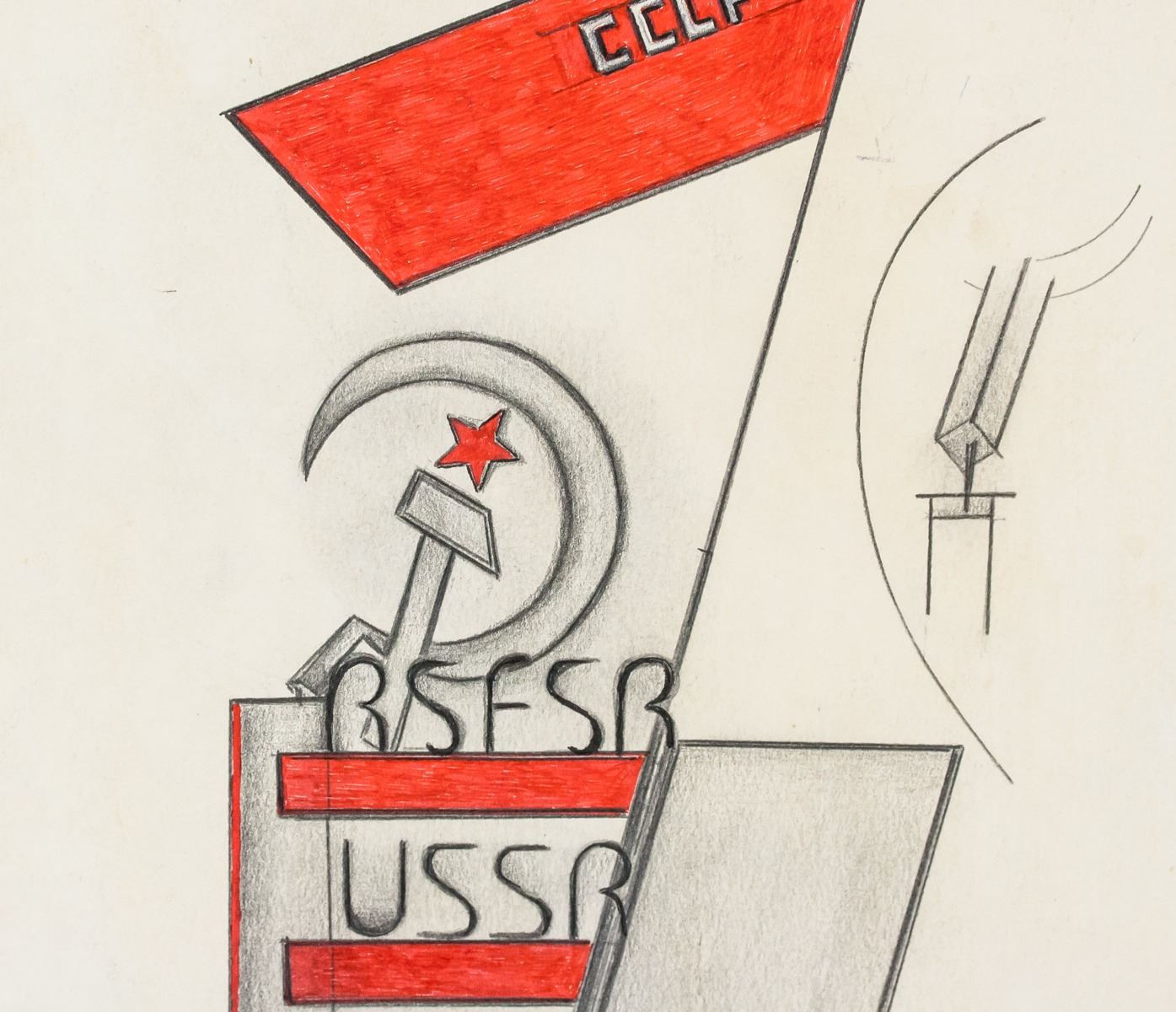 Gouache and graphite on paper. Featuring an abstract expressionist composition. Signed in Cyrillic on the lower right corner, inscribed 3./IV - 24r., and stamped with Cyrillic writing. Stamped on verso. Attributed to El Lissitzky (1890-1941, Russian). 49 x 31 cm (19 x 12 in)