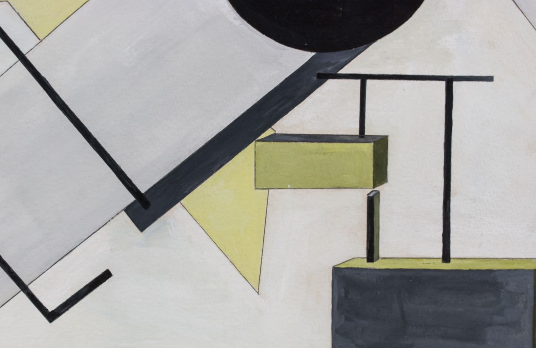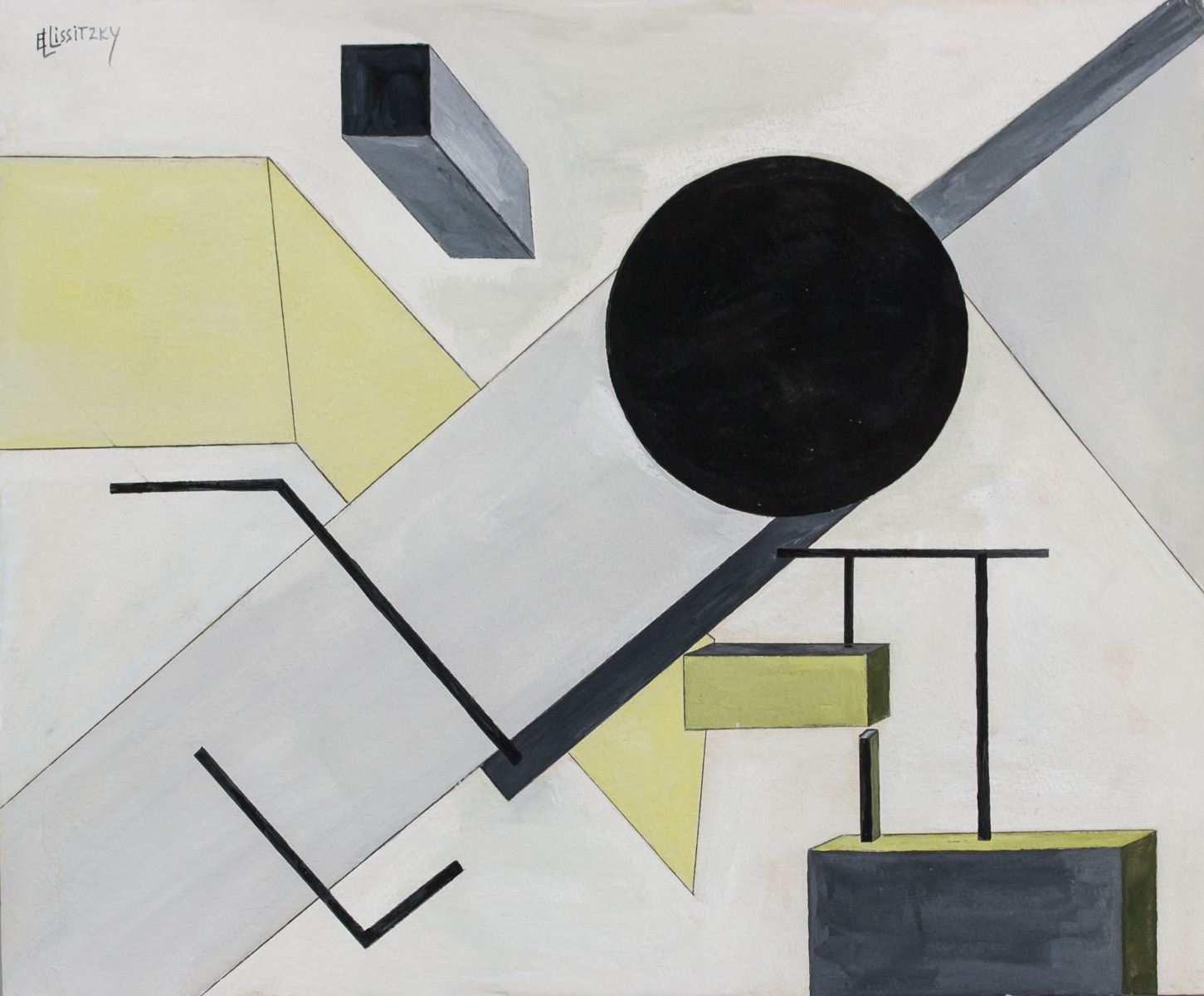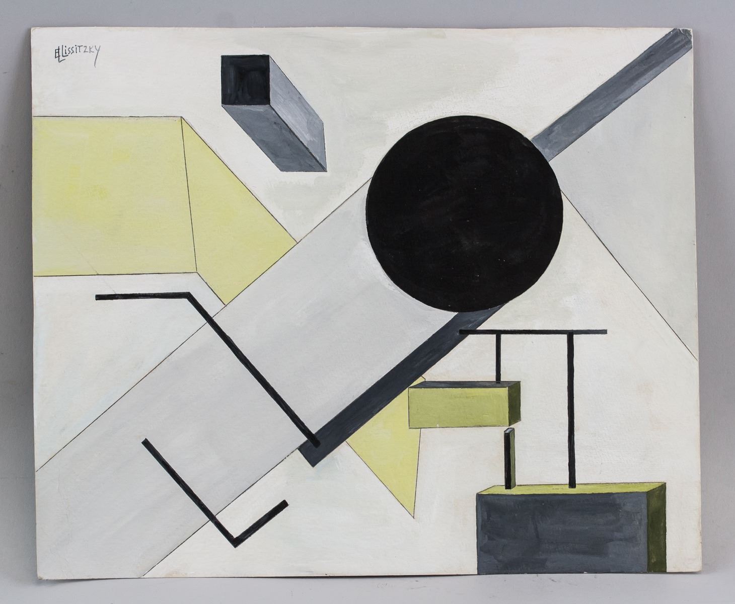 Gouache on paper. Featuring a suprematist composition. Signed El Lissitzky on the upper left corner. Attributed to El Lissitzky (1890-1941, Russian). 28 x 34 cm (11.0 x 13.4 inches). PROVENANCE: Southern Ontario estate