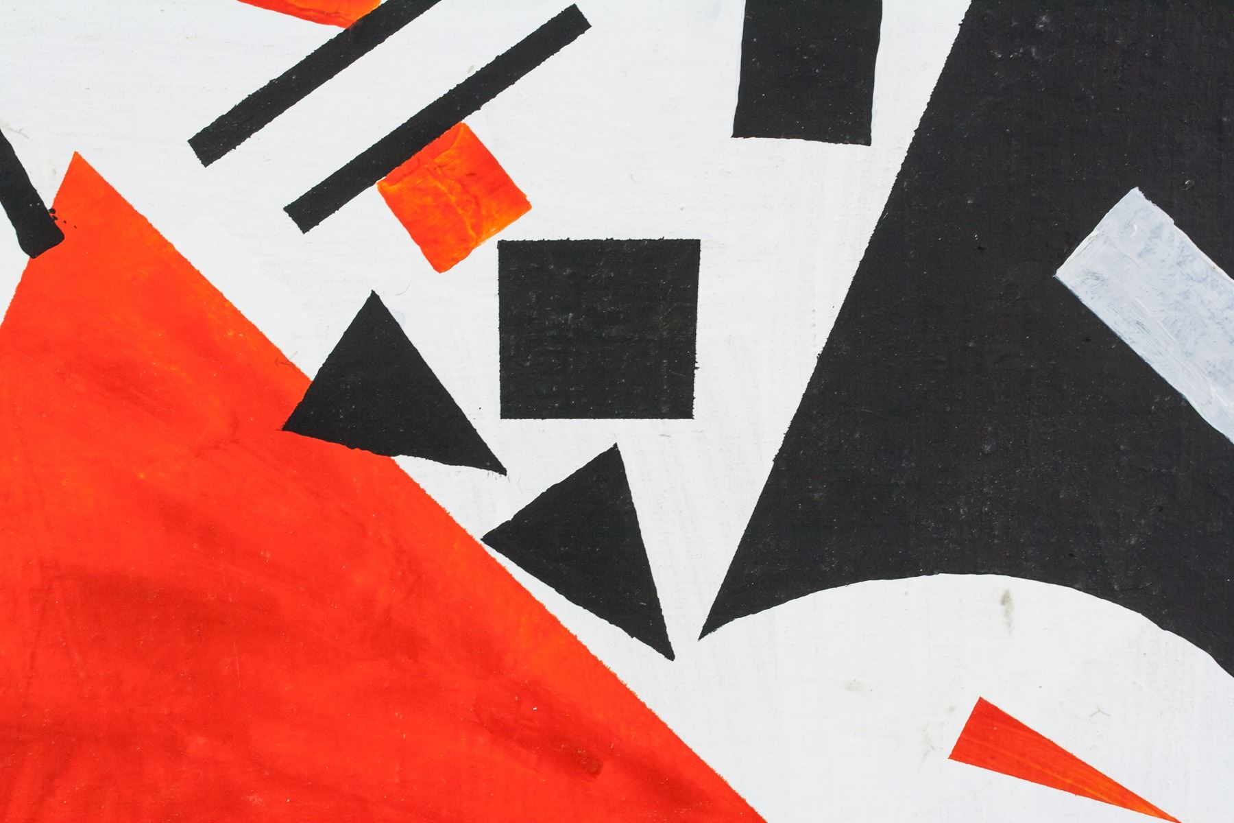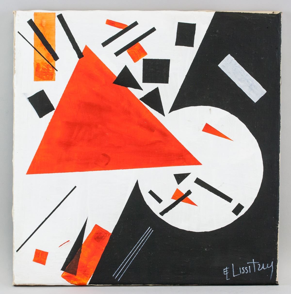 Oil on canvas. Featuring a suprematist composition. Signed El Lissitzky on the lower right corner. Attributed to El Lissitzky (1890-1941, Russian). 49 x 47 cm (19 x 18.5 inches). PROVENANCE: This lot carries limited provenance from a Southern Ontario estate