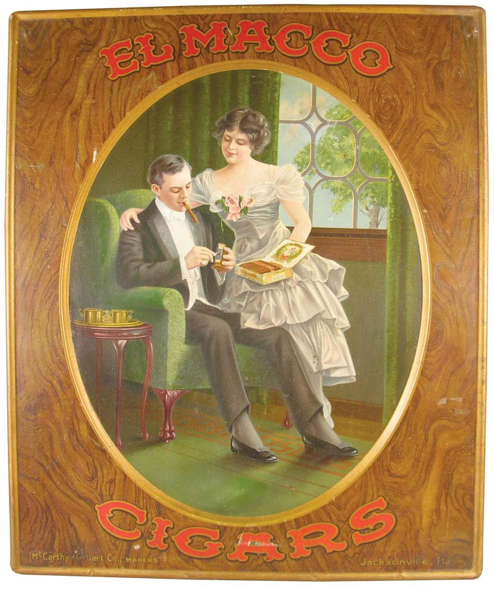 El Macco Cigars Embossed Self Framed Tin Sign. Depicting a woman offering a cigar to a man. A dent a 1:00 and a few scratches mostly around perimeter otherwise good condition. 20 X 24 inches.