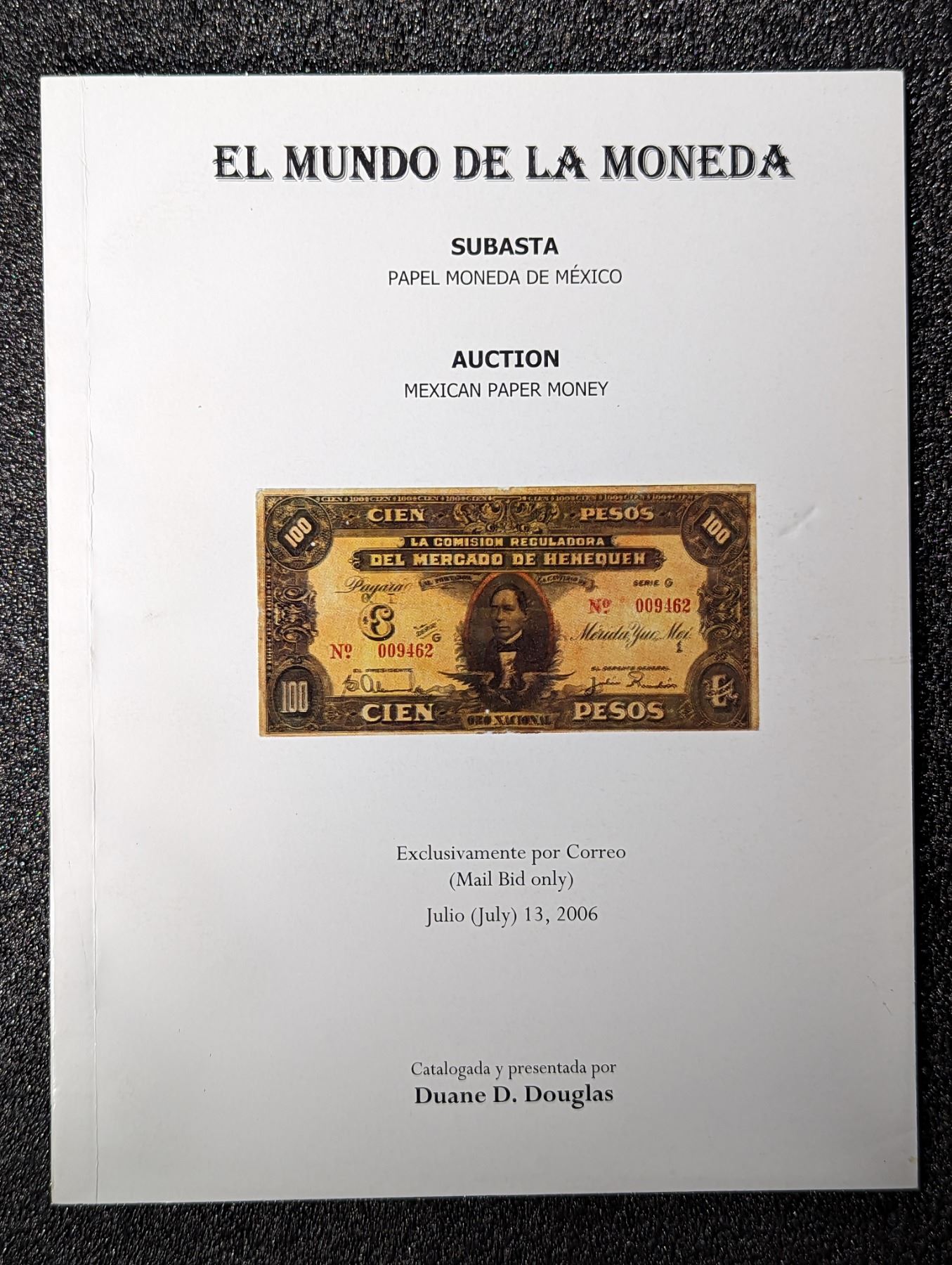 El Mundo de la Moneda S.A. de C.V. MEXICAN PAPER MONEY. July 13, 2006. 4to. 1-847 Lots. Original pictorial card covers. Mail Auction Sale. Mexico City. 35 Pages. b&w currency photos throughout. Fine. Lot weight: 0 lbs 5oz. Subject(s): Mexican Paper Money.