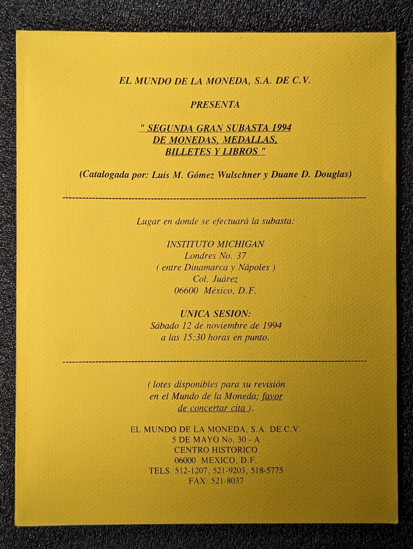 El Mundo de la Moneda S.A. de C.V. SEGUNDA GRAN SUBASTA 1994. November 12, 1994. 4to. 1-1186 Lots. Original printed card covers. Mail Auction Sale. Mexico City. 40 Pages. Fine. Lot weight: 0 lbs 4oz. Subject(s): Mexican Coinage, Medals, Paper Money.