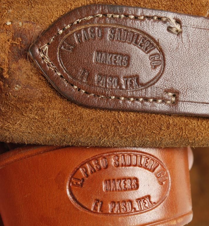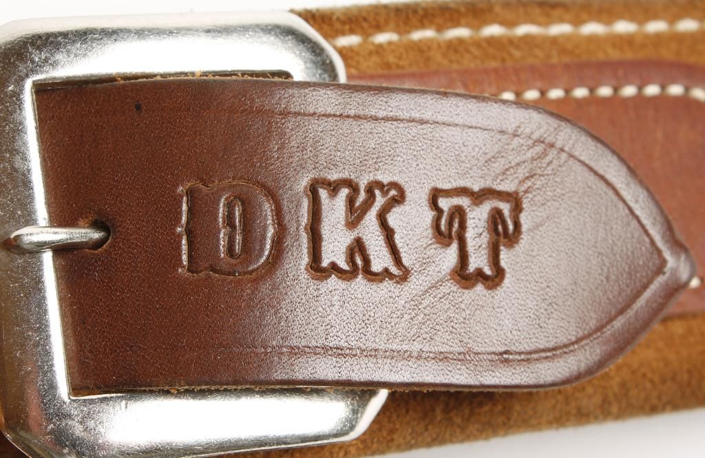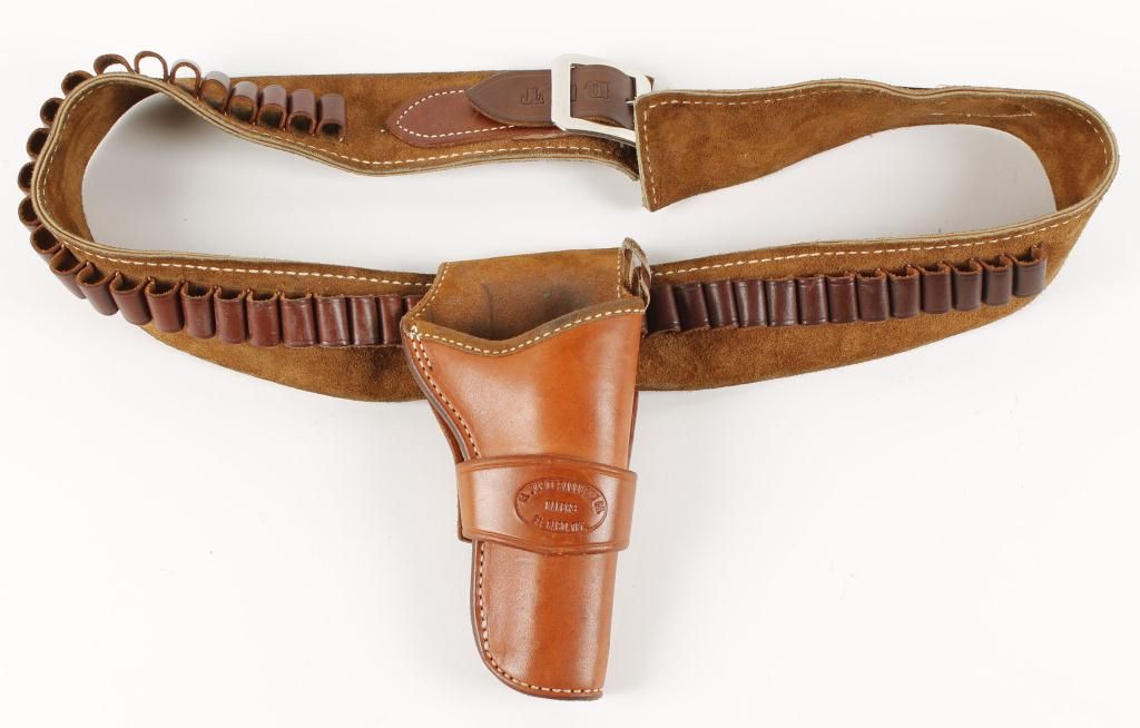 Cartridge belt is suede with leather loops, monogrammed "DKT", both are stamped El Paso Saddlery.