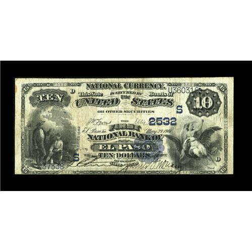 <B>El Paso, TX</B></I> - $10 1882 Value Back Fr. 577 <B>The First NB</B></I> Ch. #(S)2532<BR>An elusive large size type from here, with just four $10 Value Backs listed in the census. A problem free <B>Fine+</B></I> likely to sell for about...<BR><BR><b>Shipping:</b> Coin/Currency (<a target="_blank" href="http://www.heritageauctions.com/common/shipping.php">view shipping information</a>)