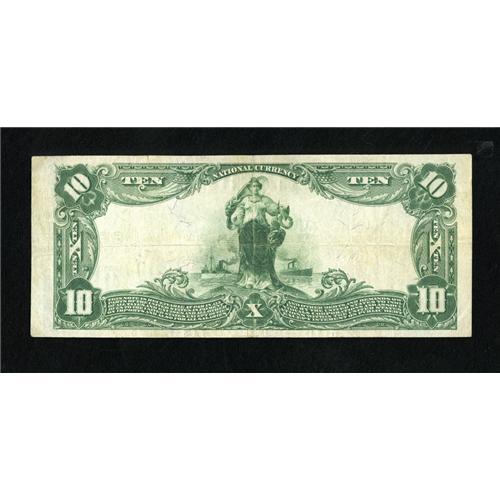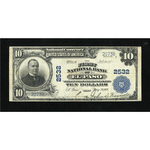 <B>El Paso, TX</B></I> - $10 1902 Plain Back Fr. 633 <B>The First NB</B></I> Ch. # 2532<BR>This is an evenly circulated <B>Very Fine</B></I> note on this bank. It does have an approximate quarter inch tear in the upper right corner. Cashier H.C. Dunbar's signature was printed light, while President Josha S. Raynolds signature is bold. The Raynolds family was also active in banking in New Mexico.<BR><BR><b>Shipping:</b> Coins & Currency (<a target="_blank" href="http://www.heritageauctions.com/common/shipping.php">view shipping information</a>)