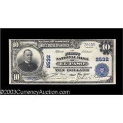 <TABLE cellSpacing=0 cellPadding=0 width="100%" bgColor=#000000 border=0><TBODY> <TR><TD width="100%"><TABLE cellSpacing=1 cellPadding=3 width="100%" border=0><TBODY><TR><TD width="100%" bgColor=#79735c><FONT face=arial color=#ffffff size=3><B>Description</B> </FONT></TD></TR><TR><TD width="100%" bgColor=#ffffff><FONT face=arial size=2><B>El Paso, TX</B></I> - $10 1902 Plain Back Fr. 633 <B>The First NB</B></I> Ch. # 2532<BR>Certainly not rare, but always a popular bank when found in high circulated grades. <B>About Uncirculated</B></I> with two light vertical folds. (400-600 ) </FONT></TD></TR></TBODY></TABLE></TD></TR></TBODY></TABLE><BR><TABLE cellSpacing=0 cellPadding=0 width="100%" bgColor=#000000 border=0><TBODY><TR> Important notice: Heritage usually auctions material at the rate of 200-250 lots per hour. On some occasions eBay Live bid software or the Internet may not be able to keep up with the pace of the auction. We recommend placing a realistic absentee bid now as insurance to avoid disappointment. Occasionally the auctioneer may eliminate or reject an eBay Live bid, and the auctioneer may also reopen a lot after the close of the eBay live bidding (usually because we missed an audience bid), and may reject your bid even if it shows you as the winning bidder. By bidding via eBay Live, you agree that Heritage may award the lot to another bidder at its sole discretion under the circumstances described above or any other reasonable circumstances. Also please note that all Heritage lots purchased through eBay Live carry a 20% Buyer's Premium. Please make sure you read the Terms and Conditions before you bid.</TR></TBODY></TABLE>