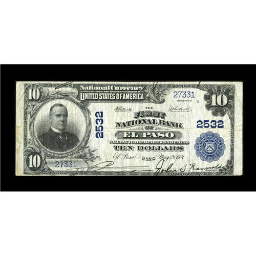 <B>El Paso, TX</B></I> - $10 1902 Plain Back Fr. 633 <B>The First NB</B></I> Ch. # 2532<BR>While this is certainly not a rare bank, it is from a locale always popular with collectors. Tonight's <B>Very Fine</B></I> $10 Plain Back retains much crispness and displays darkly stamped signatures.<BR><BR><b>Shipping:</b> Coin/Currency (<a target="_blank" href="http://www.heritageauctions.com/common/shipping.php">view shipping information</a>)