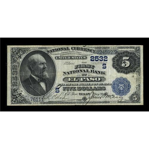 <B>El Paso, TX</B></I> - $5 1882 Value Back Fr. 574 <B>The First NB</B></I> Ch. # (S)2532<BR>A scarcer type and denomination from this well collected west Texas location. <B>Fine-Very Fine,</B></I> and more than adequately margined for a $5 Value Back.<BR><BR><b>Shipping:</b> Coins & Currency (<a target="_blank" href="http://www.heritageauctions.com/common/shipping.php">view shipping information</a>)