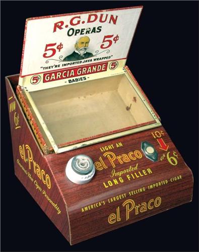 El Praco Cigar Lighter and Store Display, cardboard. R.G. Dun cigar box and garcia glass lid. Excellent working condition. 9 1/2 X 9 X 10 inches.
