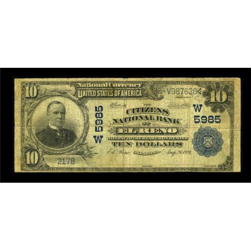 <B>El Reno, OK</B></I> - $10 1902 Plain Back Fr. 634 <B>The Citizens NB</B></I> Ch. # (W)5985<BR> A very common bank in small, but one which is not terribly easy to find in large. It has been almost ten years since any 1902 Blue Seal from here has been available at public sale according to Track and Price. <B>Very Good+.</B></I><BR><BR><b>Shipping:</b> Coins & Currency (<a target="_blank" href="http://www.heritageauctions.com/common/shipping.php">view shipping information</a>)