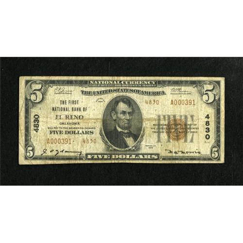 <B>El Reno, OK</B></I> - $5 1929 Ty. 2 <B>The First NB</B></I> Ch. # 4830<BR> A few pinholes are noticed on this example marked by three survivors for type in the census. <B>Very Good</B></I>.<BR><I>From The Rolling Plains Collection</B></I><BR><BR><b>Shipping:</b> Coins & Currency (<a target="_blank" href="http://www.heritageauctions.com/common/shipping.php">view shipping information</a>)