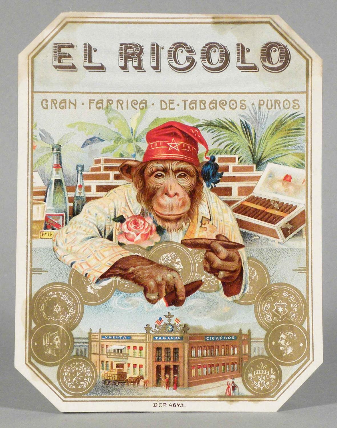 El Ricolo Cigar Box Label. Rare image of monkey and factory scene. Beautiful colors and gold leaf. Some minor staining otherwise very good condition. 4 1/8 X 5 3/8 inches. Starting bid $100