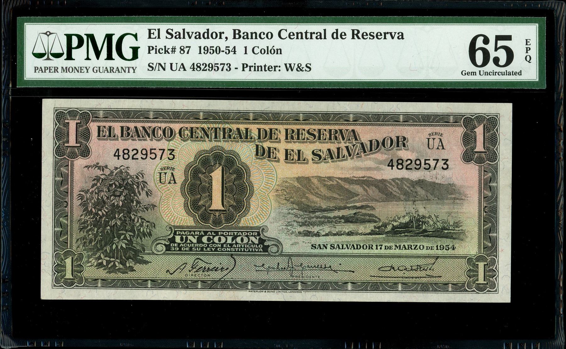 El Salvador, Banco Central de Reserva, 1 colon, 17-3-1954, series UA, serial 4829573, PMG Gem UNC 65 EPQ. SCWPM-87. With black 15-10-1954 validation overprint on reverse. Tied with one other for finest known in the PMG census. PMG #8063863-002.