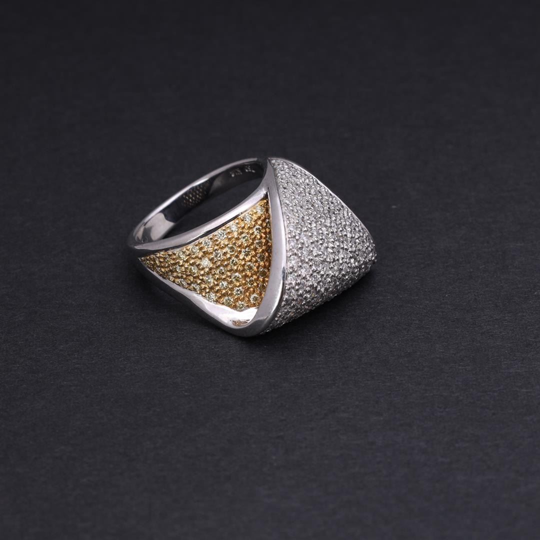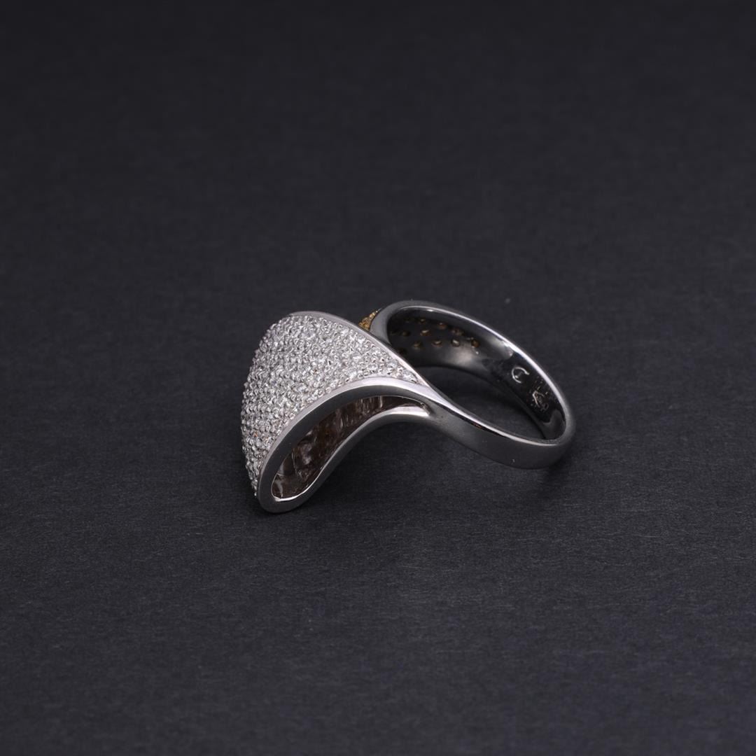 Elaborate 18k gold cluster ring; each overlapping fold set with numerous yellow and white diamods, the interior band marked k18 750 with stylized letter; gross weight 11.9 g, size 7