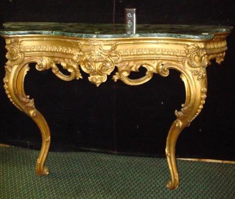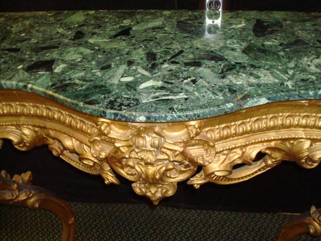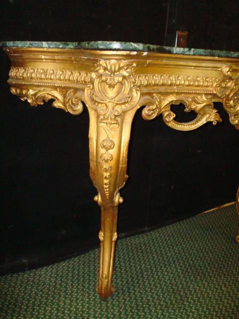 Elaborate 19th C. Italian Marble Top Console Table: Gilt Ca. 1875 Table with Heavy Decoration. Green Serpentine Marble. Some Repair. (600-900)