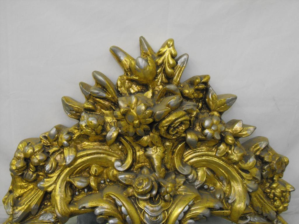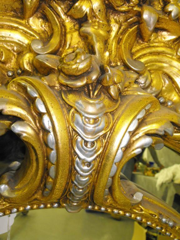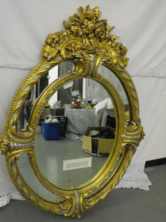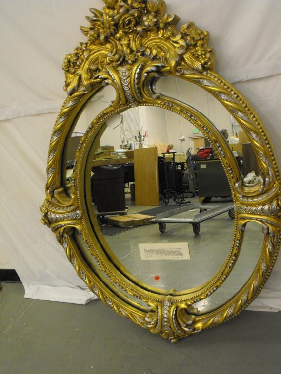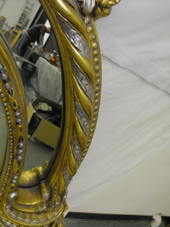 Louis XVI French baroque style gesso frame mirror. Oval shape with wraping rope and pebble boarder and large scrolls at top and bottom of mirror. Highlighted with silver painted profiles in like new condition 58" tall 44" wide.