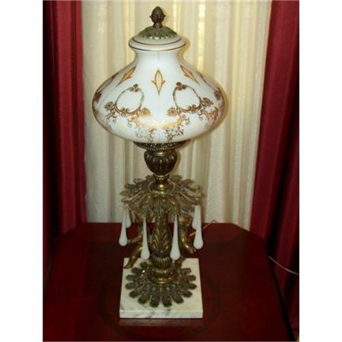 We have a beautiful vintage lamp with cherubs and opal glass drops with an elaborate glass shade.