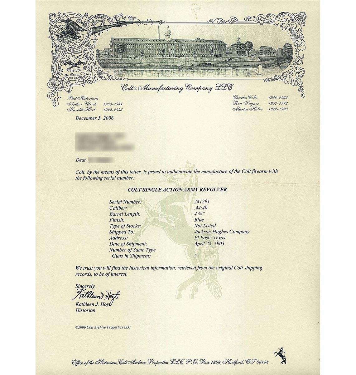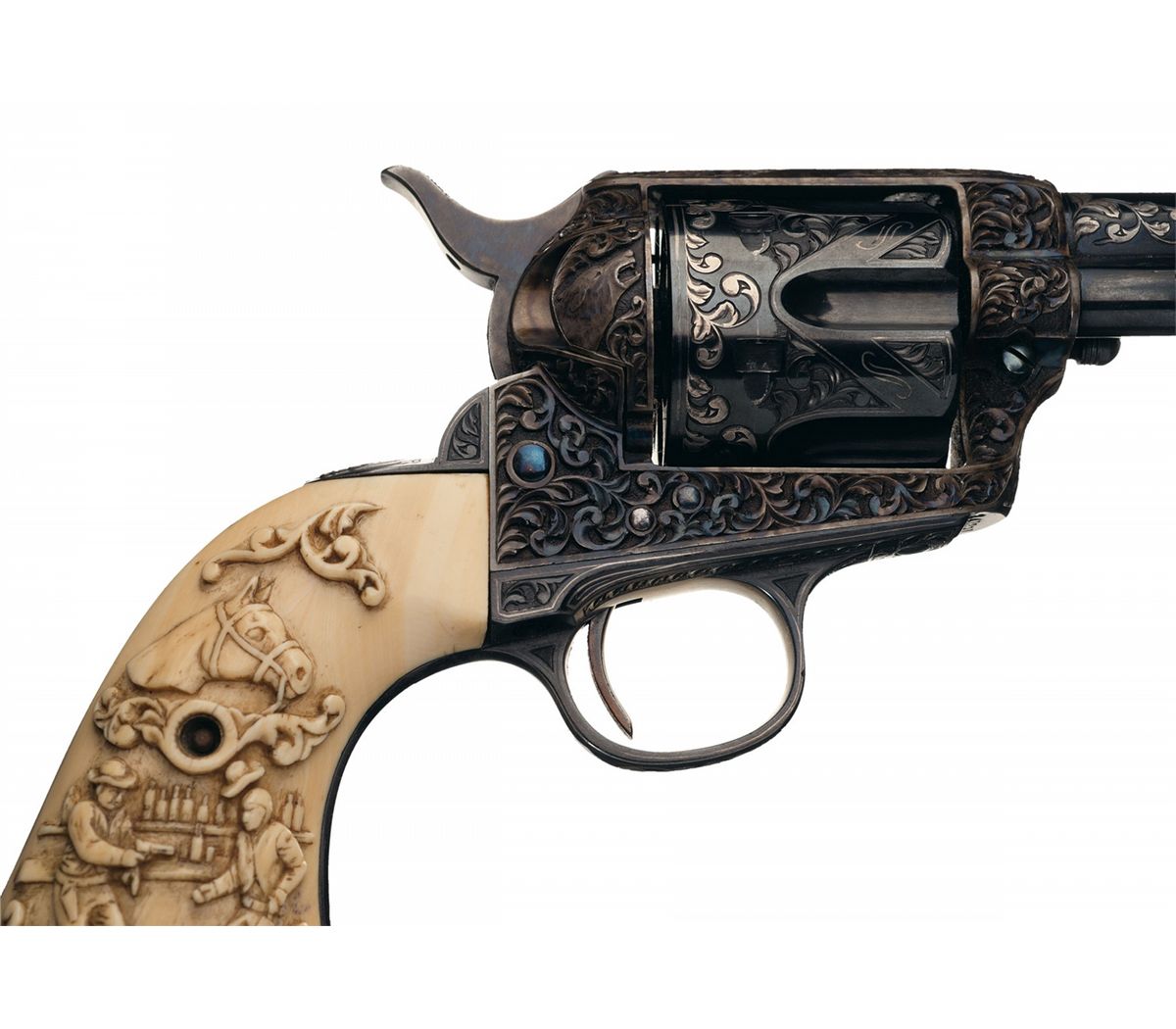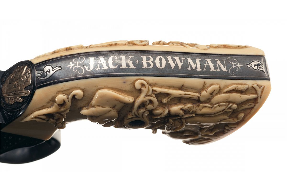 Manufactured in 1903 and subsequently rebarreled/rechambered and elaboratly professionaly embellished. Blade front and pinched frame rear sights. Floral scroll with punch dot engraving on the sides of the front sight. Vine leaf, silver inlayed engraving in triangular and half triangular patterns on the barrel with a silver inlaid muzzle band. Marked with the Colt one line address on the top of the barrel and "45 Colt" on the left side. The casehardened frame is raised relief scroll engraved with a lion on the recoil shield and a wolfs head on the loading gate. Marked with the Colt two line patent dates on the left side. The cylinder is scroll engraved with silver inlays and a double ring at the rear. The trigger guard and front strap are floral scroll, silver inlaid and border engraved. The back strap has a gold inlaid indian head at the top with "JACK BOWMAN" marked inside a floral border with silver inlaid accents. "HOWARD COLSON/ENGRAVER" is marked on the bottom. Matching serial numbers on the frame and backstrap. Fitted with carved ivory grips depicting western scenes with a mountain lions head on the left and a horses head on the right. The accompanying factory letter confirms the serial number, blue finish, grips as "Not Listed", 44/40 caliber, 4 3/4 inch barrel at the time of shipment and that the revolver was shipped April 24, 1903 to the Jackson Hughes Company in El Paso, Texas. Complete with a glass faced wood display case with a silver plaque engraved "COLT BUNTLINE SPECIAL/ 45 CAL 1871/ENGRAVED by EDWARD COLSON/ for JACK BOWMAN/ALL MATCHING NUMBERS 241291".