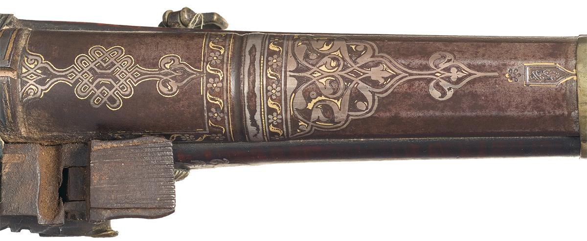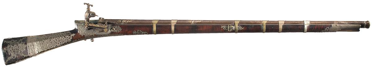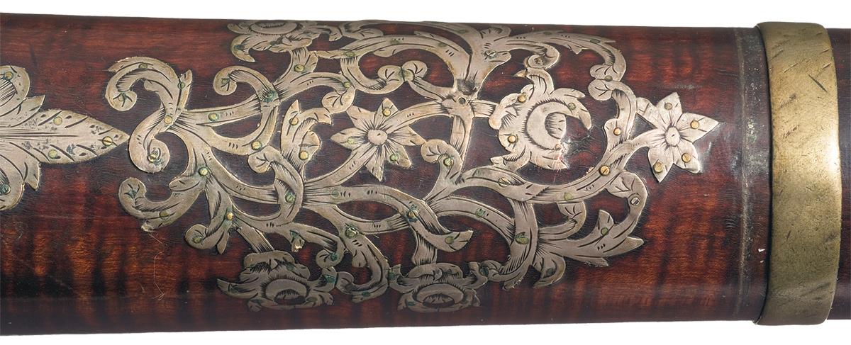 Pin front and notch rear sights, with gold and silver inlaid bands at the muzzle and breech, scroll and floral inlaid designs, and a set of 6 barrel bands, with two made of silver. Additional gold and silver scrollwork is present on the lock, with an engraved solid silver plate on the upper tang. Smooth straight grip stock, with extensive floral engraved silver overlaid coverage, including a large number of pierced scroll designs, a smooth plate on the tip and a solid engraved panel on the comb and around the buttstock.
