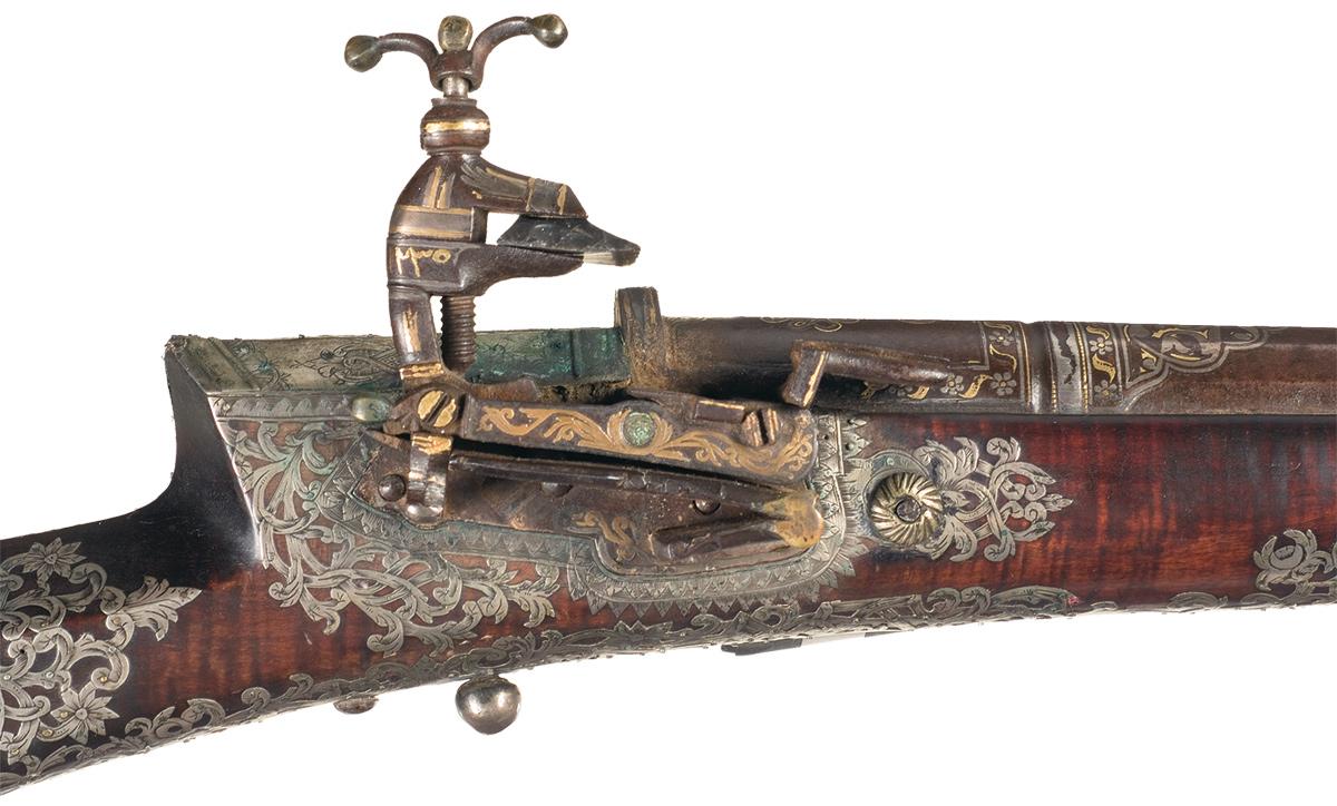 Condition: Fine, with a deep brown color on the barrel, pitting around the touchhole, and some metal loss on the high points. Stock is very fine, with a few loose or absent sections, minor chips, and light pressure dents. Mechanically good. A truly exceptional miquelet musket!