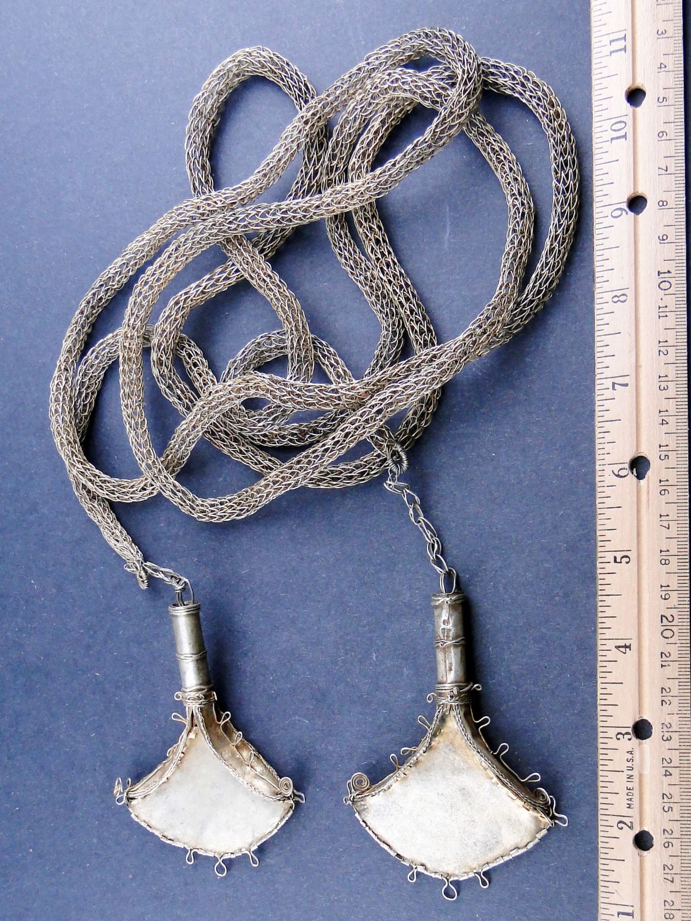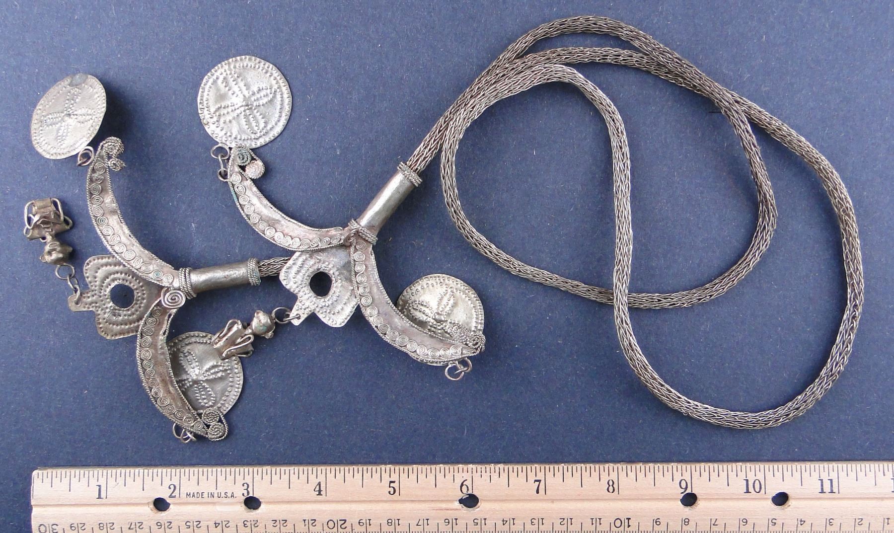 Description: Two additional Sumba kanotars, one with highly elaborate design including wire scrollwork, plain and twisted, with repoussé disks and human figures; this latter piece is illustrated in Opitz, p. 170, right, second from bottom.