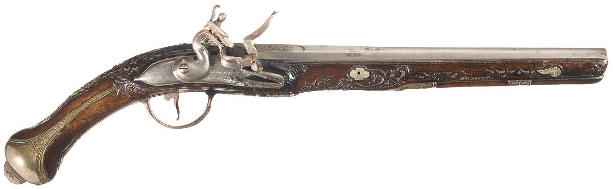 Elaborate London Marked Flintlock Pistol with Engraving, Silver Inlays and Plating and a Holster