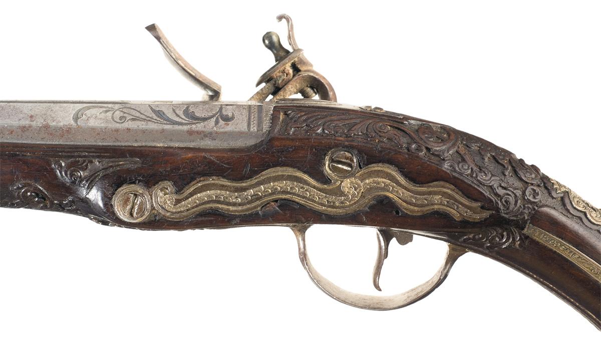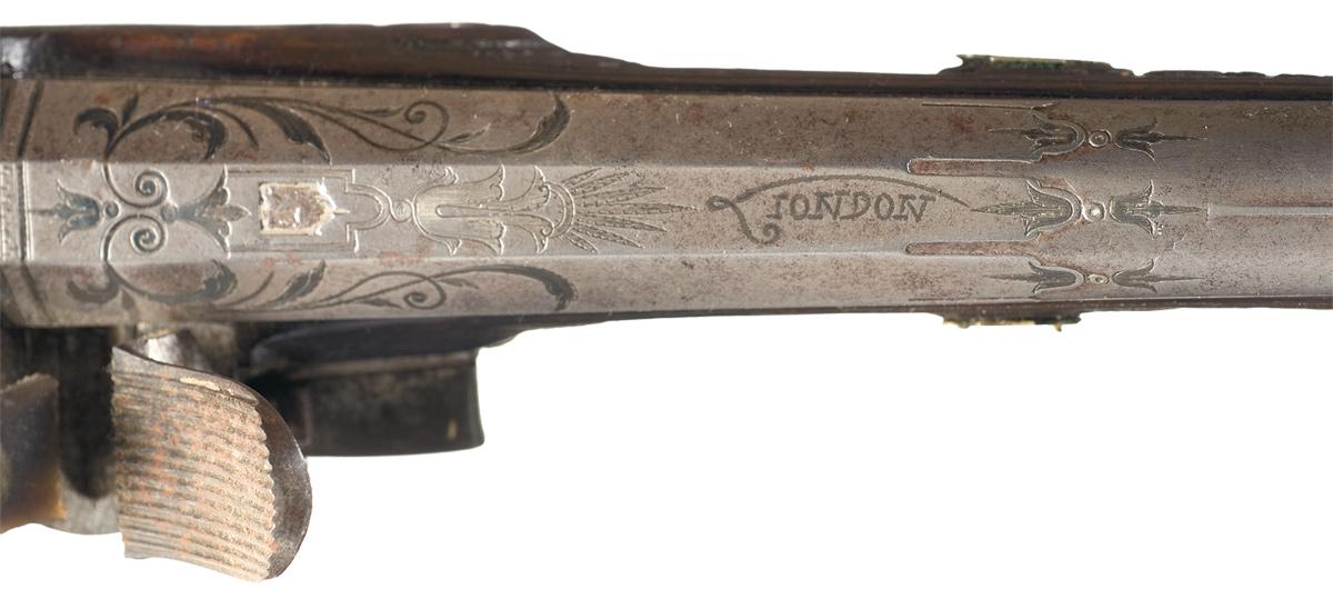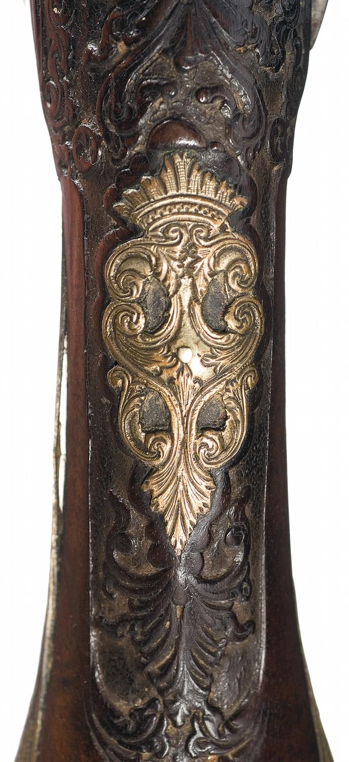 Produced without sights, the barrel has a silver lion seal on the top flat, surrounded by silver inlaid scrollwork, a floral pattern and "LONDON" on top, a thin rib running towards the muzzle, and a raised engraved silver teardrop plate. Scroll engraved lock plate, with two lines of untranslated Greek lettering, and the trigger guard is engraved and fitted with raised silver scrollwork. Full length stock, with silver pin escutcheons, raised carved scrollwork, silver plate enhanced ramrod pipe, reverse plate with raised silver serpent decoration, silver scroll and crown design on the wrist and an engraved buttcap. With a black and red leather holster, configured for a brace of pistols, with decorative stitching and a tan colored woven tassel.