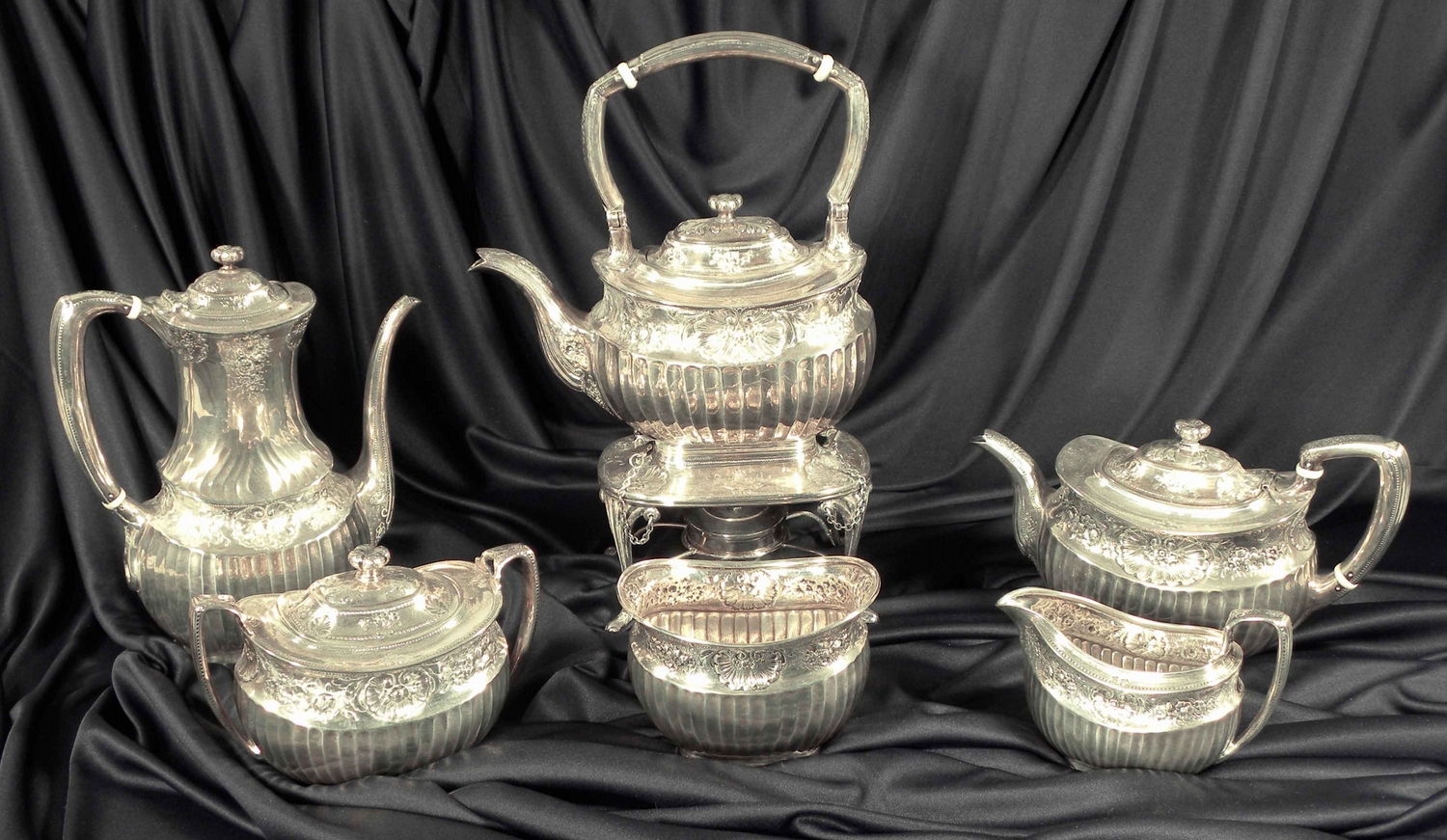 Elaborate Tiffany Sterling Silver Tea Set. 6 pieces. Total Weight 146 U.S. ounces. 16 oz. per lb. Excellent condition.