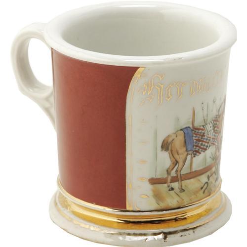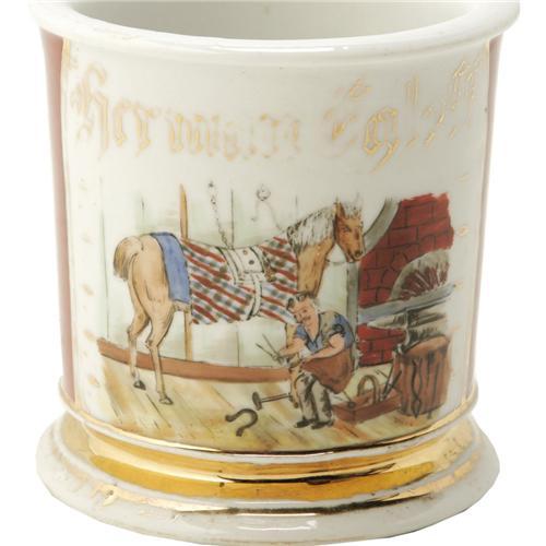 <B>Elaborately Decorated Blacksmith Occupational Shaving Mug.</B></I> Great color and detailed scene of the blacksmith shoeing a golden stallion. As with many of the occupational mugs, the gold decor and lettering of the name of the owner is worn, but still readable. The image of the blacksmith and horse are bright and colorful with lots of detail, including the smithy's fire used in his work. The mug is 3.75" tall with no chips or cracks and has an exceptional look.<BR><BR><b>Shipping:</b> Large Collectibles (<a target="_blank" href="http://www.heritageauctions.com/common/shipping.php">view shipping information</a>)