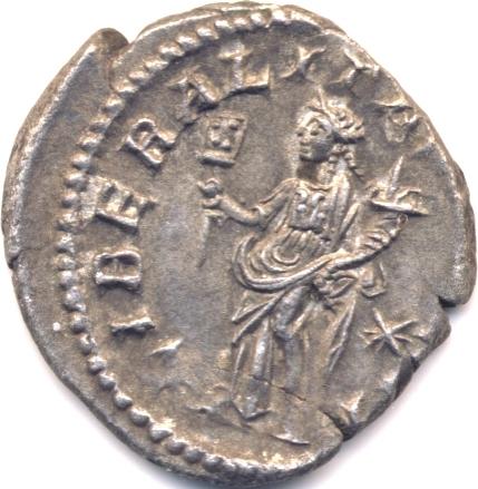 Libertas standing facing, head left, pileus in right hand, transverse scepter in left