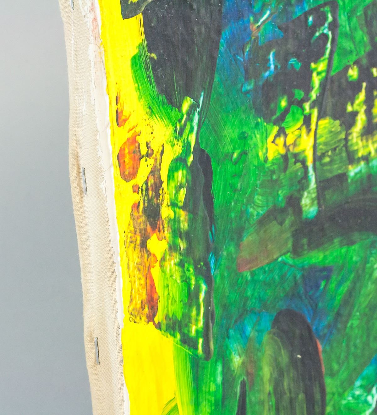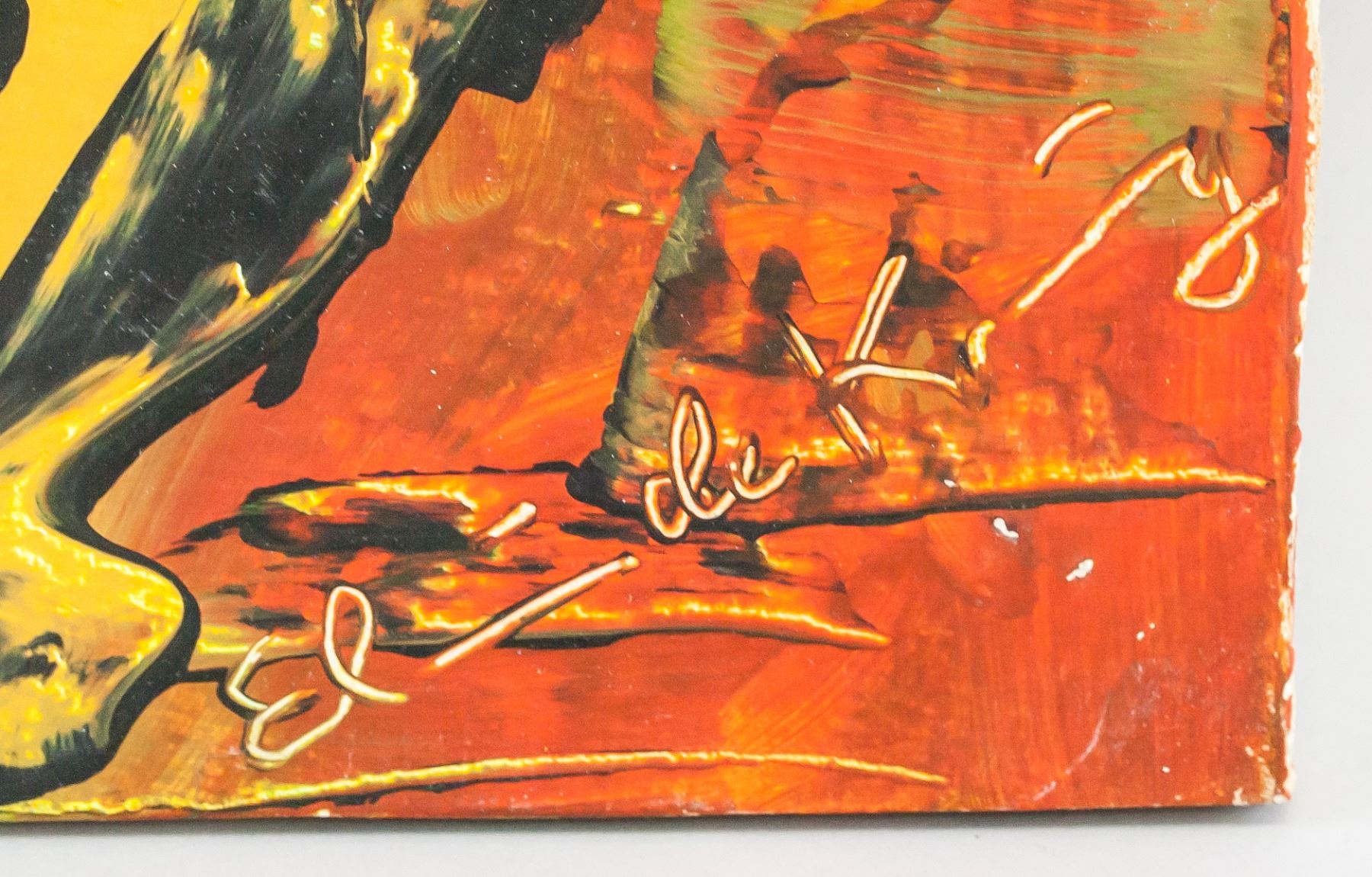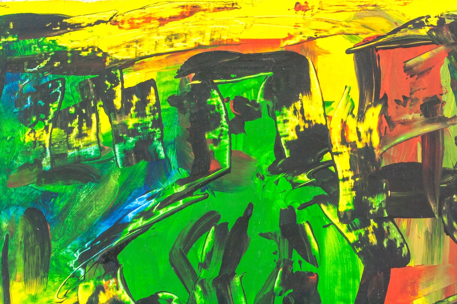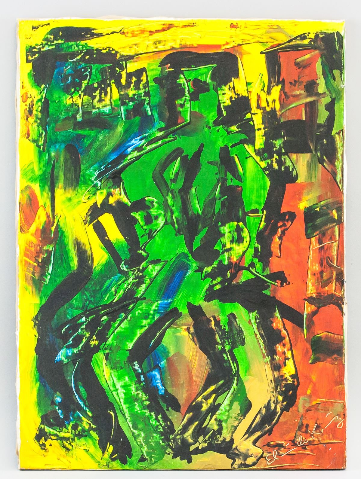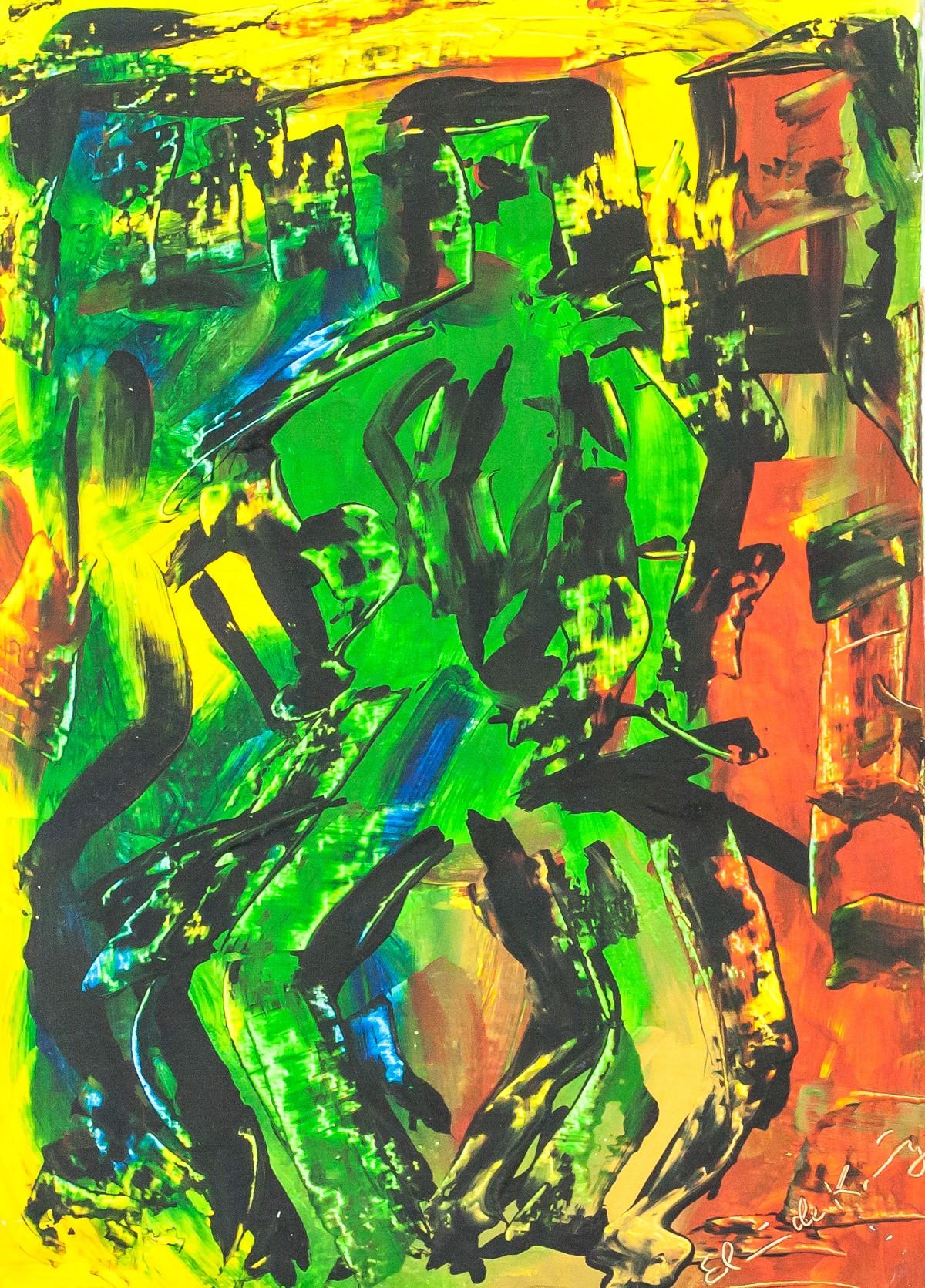 Oil on canvas. Featuring blocky figures against a green and yellow background. Signed "Elaine de Kooning" in the bottom right corner. Attributed to Elaine de Kooning (1918-1989, American). 55 x 40 cm (21.75 x 15.75 in). Provenance: This lot carries limited provenance from a Southern Ontario estate.