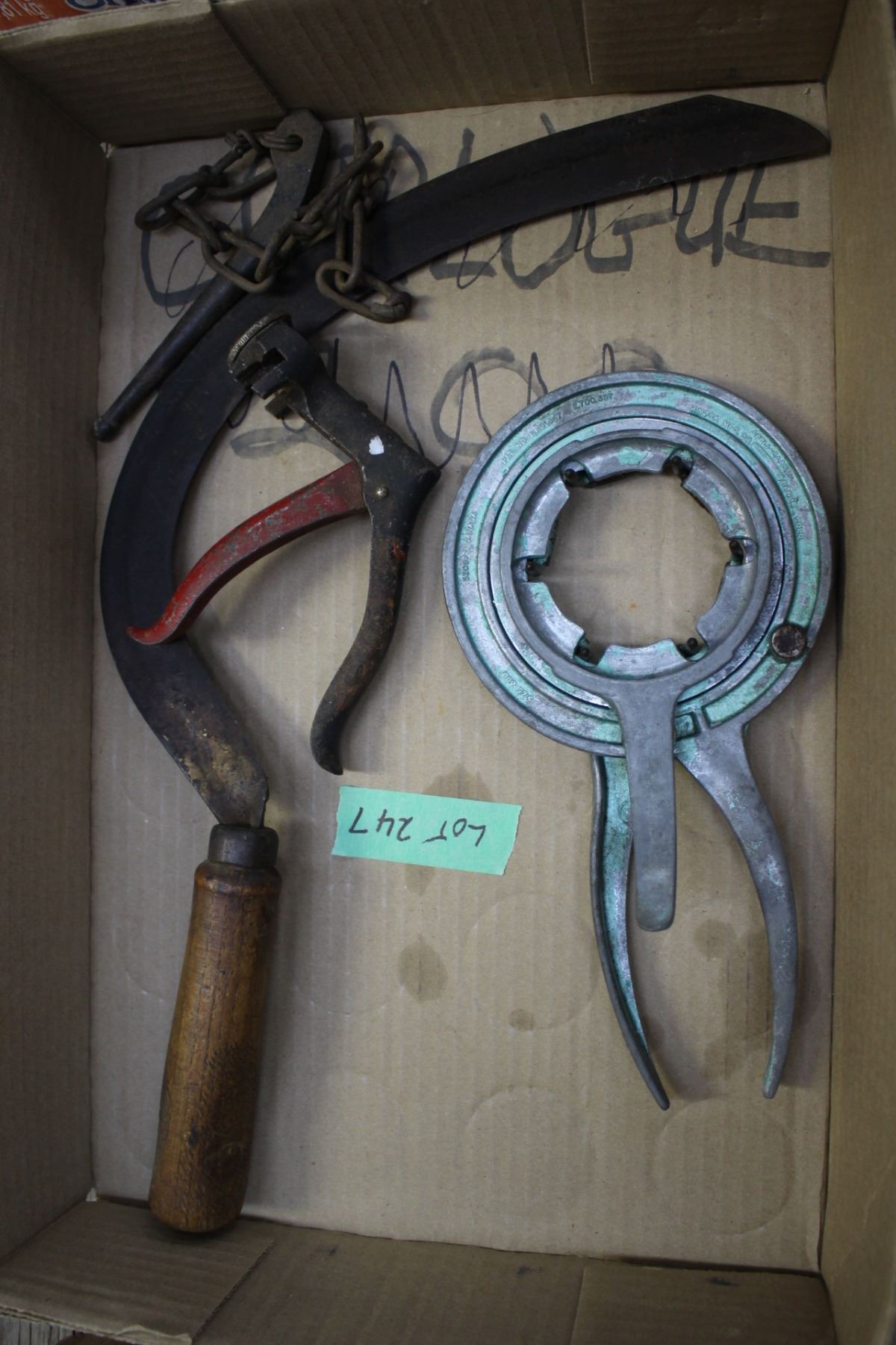 Elastic Band Steer Castrating Tool; a Hand Scythe and Misc.