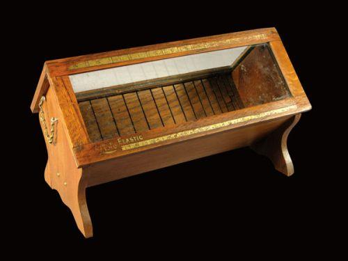 Elastic Display Oak Showcase. Maker name worn off and stencil worn otherwise good condition. 16 X 9 1/2 X 9 inches.