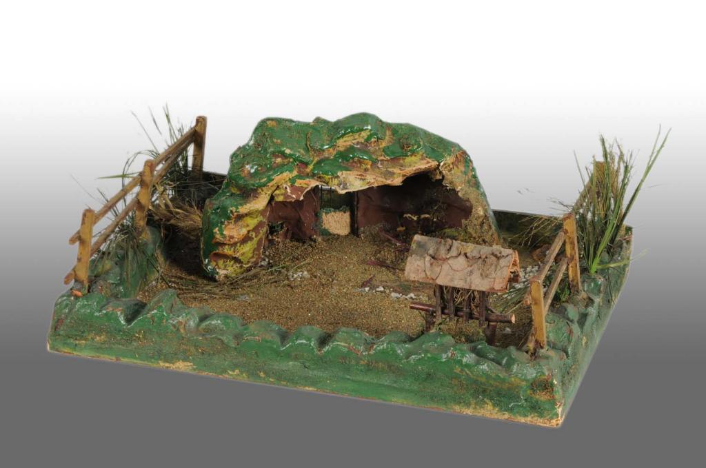 Circa 1920s. Early Elastolin item. Complete with feeding bin, paper mache cave and paper mache rocks, and wooden platform with wooden fence. Scenic landscaping is complete and all original. Minor damage to paper mache cave. Scarce item. Condition (Excellent). Size 22" x 17".