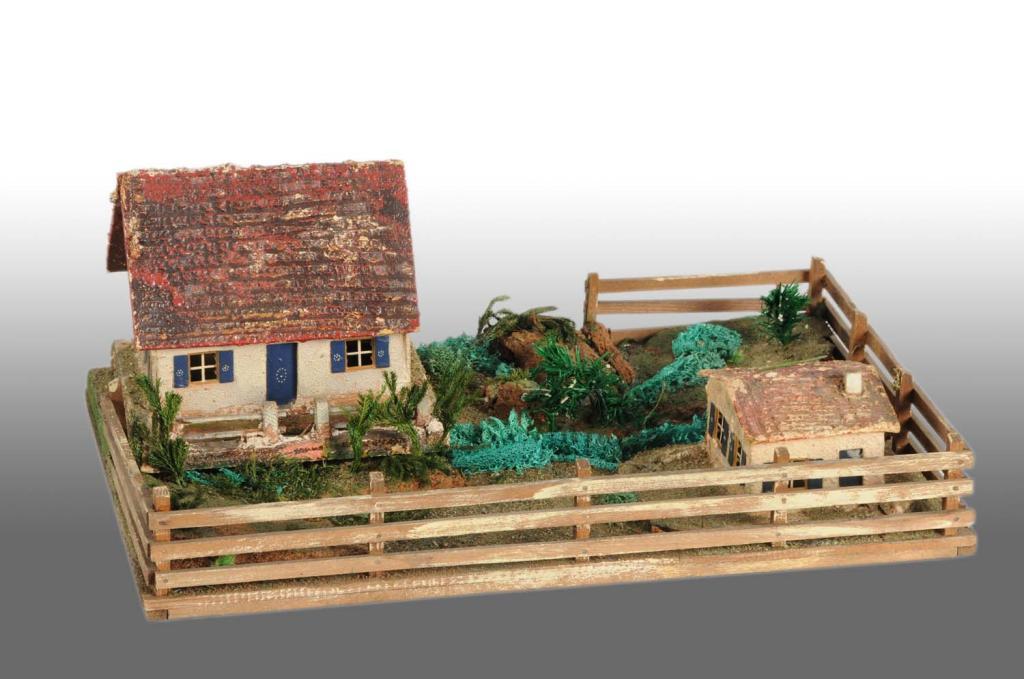 Circa 1920s. Cottages on wooden platform. Scarce item. Cottages are wood and composition, and plaster materials. All bushes and landscaping are intact and in nice condition. Both cottages show wear to the roofs. Condition (Very Good). Size 19" x 12".