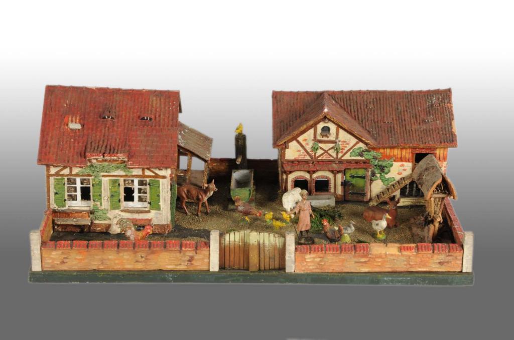 Very early and all original Elastolin piece, circa 1920s. Made of wood and composition. Includes various trees, a well, an animal feeding platform and 13 Elastolin figures. Some composition detailing is missing, some window frames are missing, and some cracking to the house roofs. Houses have interiors with hinged doors in the back. Item is extremely scarce. Size 29" x 16".