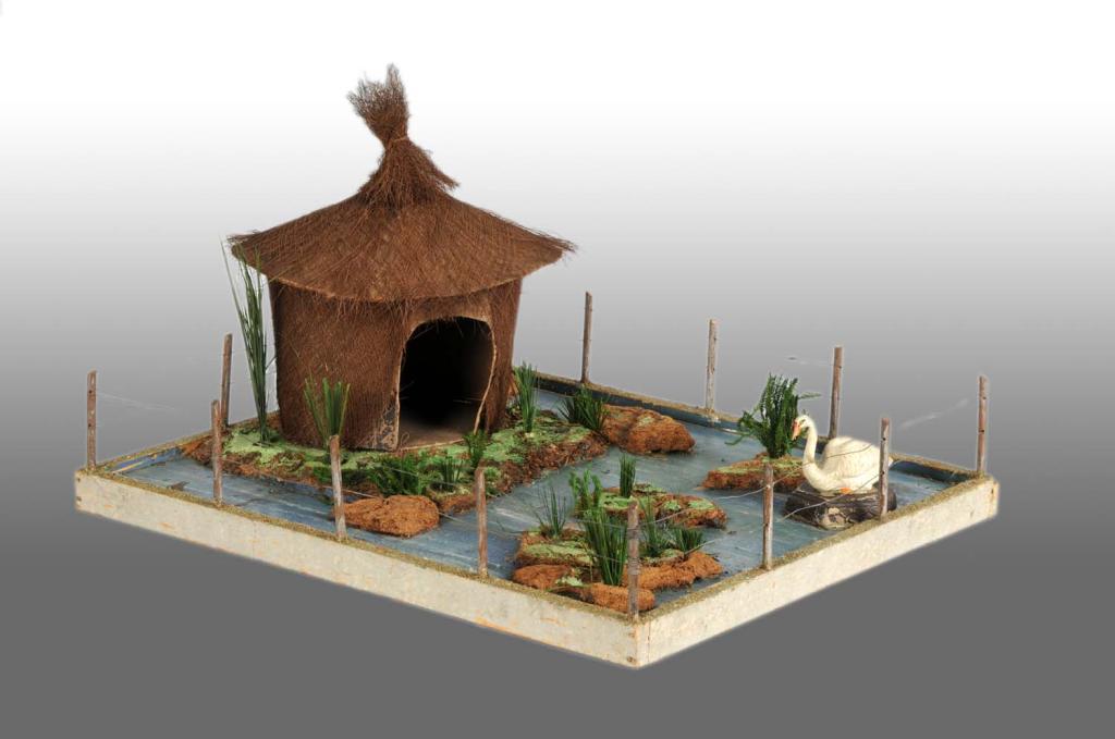 Circa 1920s. Very scarce item with simulated painted water, numerous items, a platform with a swan, a cardboard grass-covered hut and swamp-like landscaping. All original wooden poles and wire fencing. Nice display in excellent to excellent plus condition. Size 20" x 16".