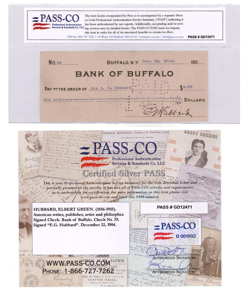 ELBERT GREEN HUBBARD (1856-1915) American writer, publisher, artist and philosopher. Check Signed, “E.W. Hubbard.” Bank of Buffalo. Buffalo, New York. December 22, 1904. Perforation cancellation affects Hubbard’s signature. Overall Extremely Fine. This item has been encapsulated by PASS-CO, LLC and is accompanied by a Certified Silver PASS.