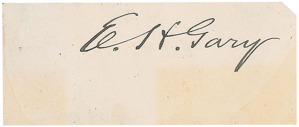 One of the founders of US Steel (1846–1927). The city of Gary, Indiana, is named for him. Ink signature, “E. H. Gary,” on an off-white 3.5 x 1.5 slip. In fine condition, with some light toning below signature.