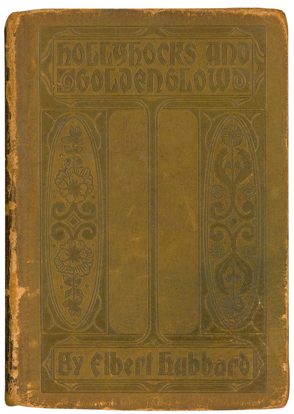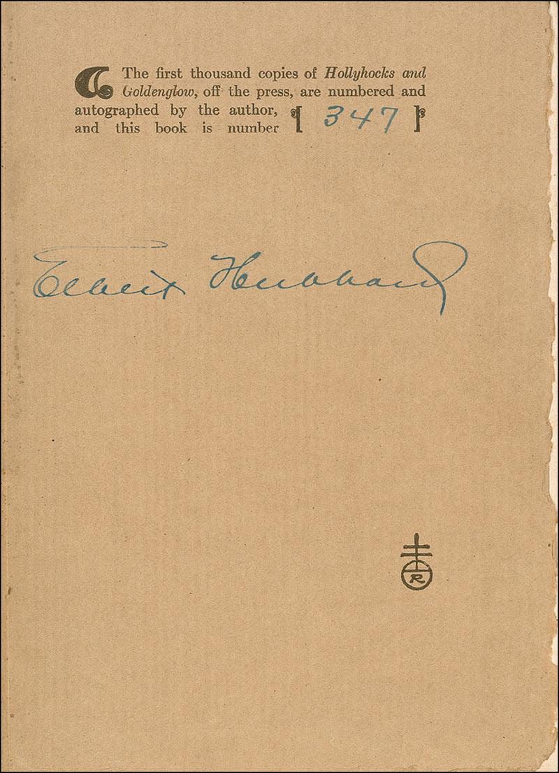 American writer, printer, and philosopher (1856–1915), closely associated with the Arts and Crafts movement, who perished in the Lusitania disaster. Signed book: Hollyhocks and Goldenglow. First edition, first printing. NY. 1912. Softcover, 5.25 x 7.25, 158 pages. Signed on the limitations page, indicating “the first thousand copies…off the press are numbered and autographed by the author and this book is number 347,” in blue ink by Hubbard. Scattered mild foxing to pages, and scattered chipping and surface loss to slightly fragile covers and spine, otherwise very good condition.